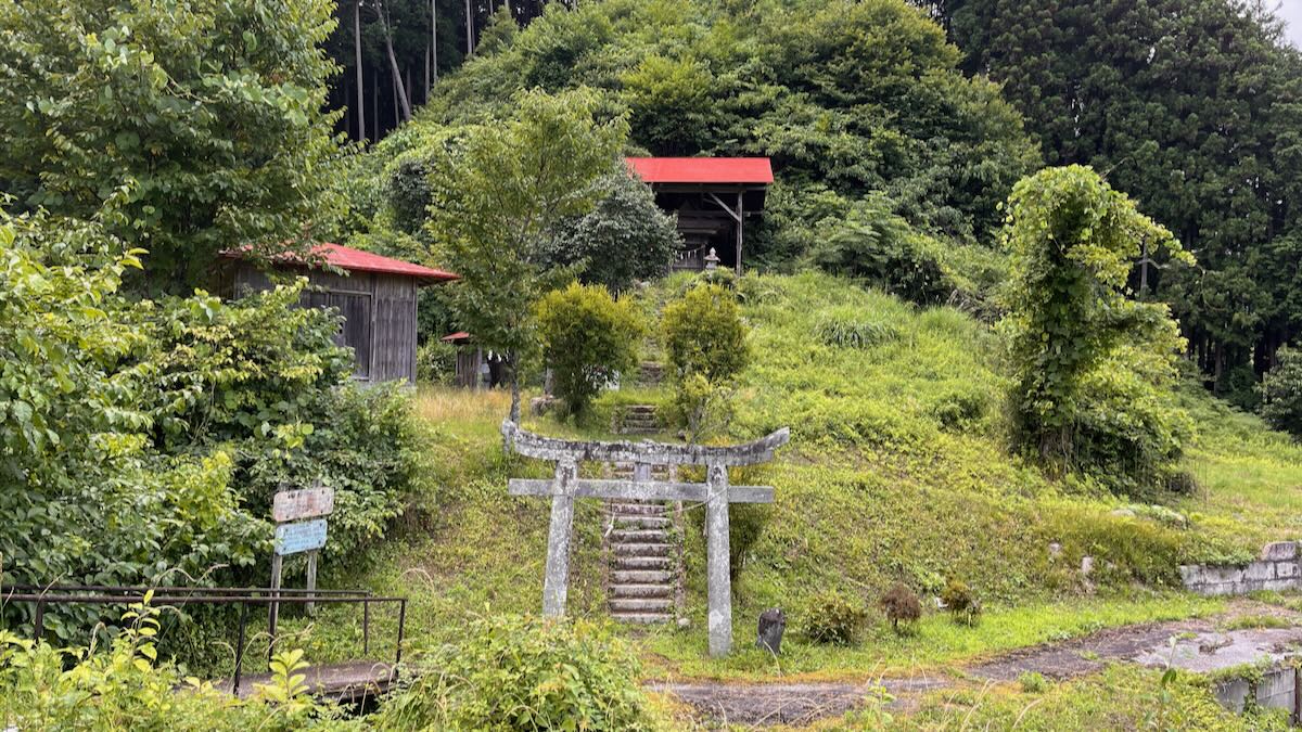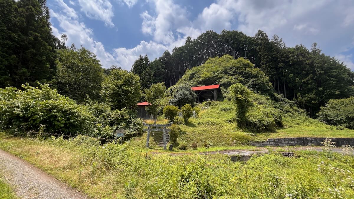 久我神社入口社号標の700m先を280号線から左折して南に入り荒井川にかかる富沢橋を渡って聚落を抜けた山腹に鎭座。