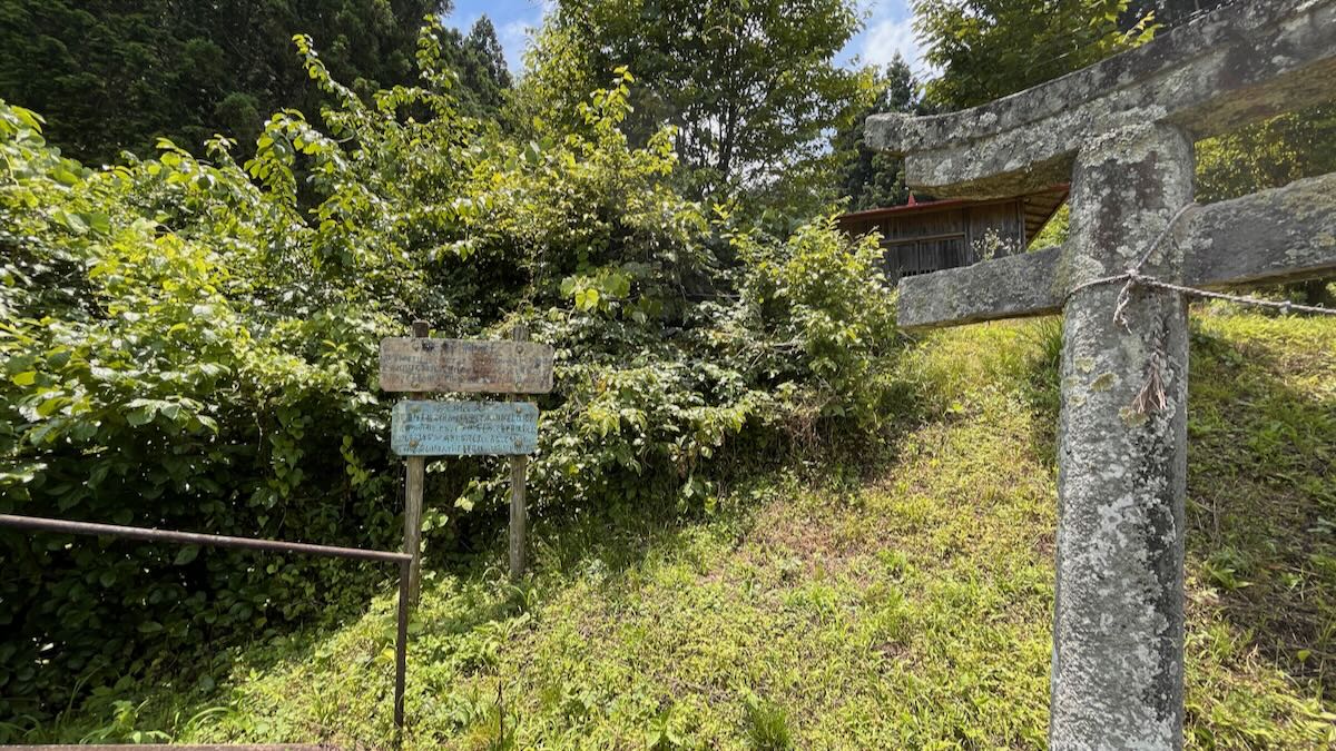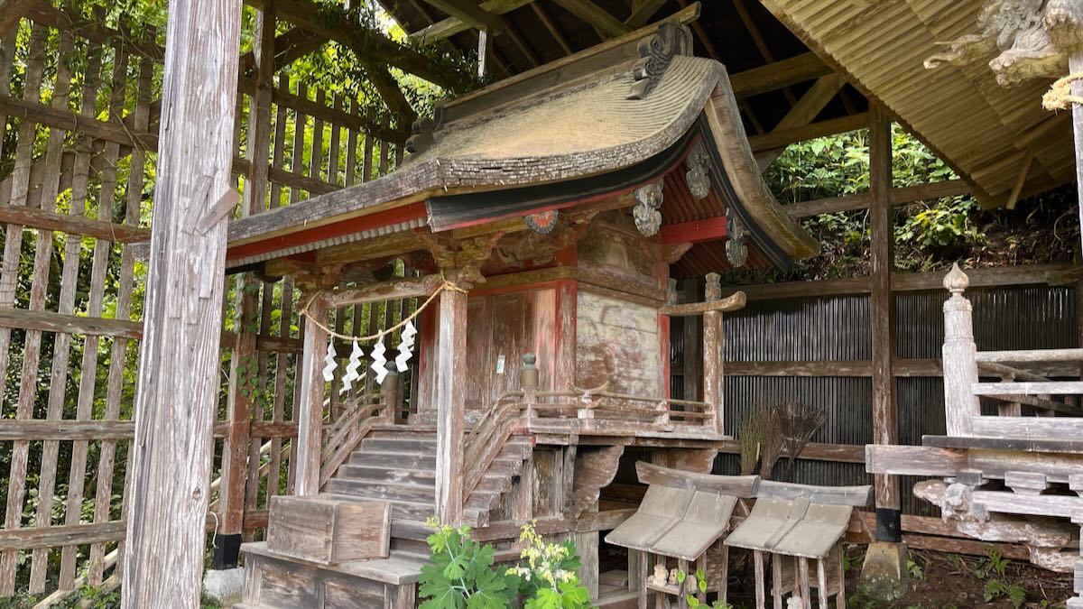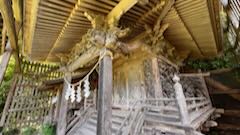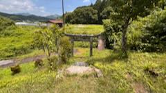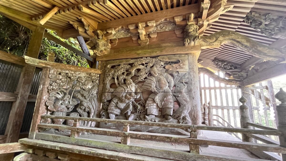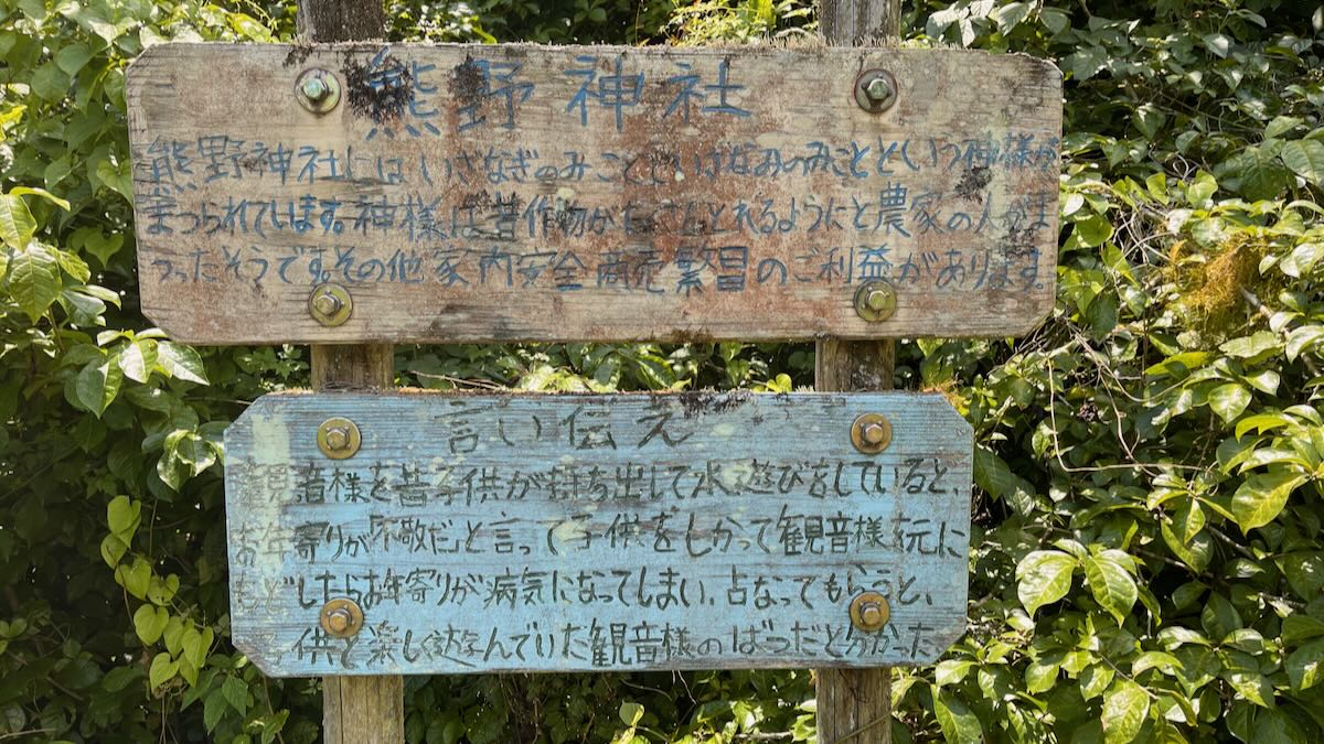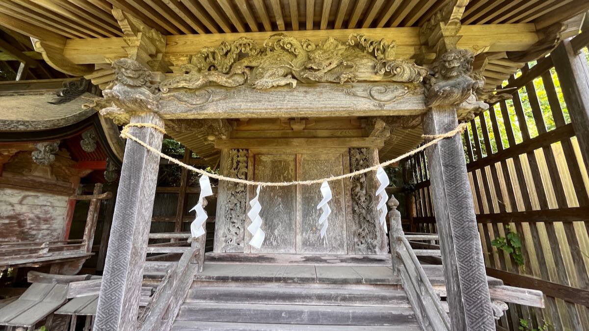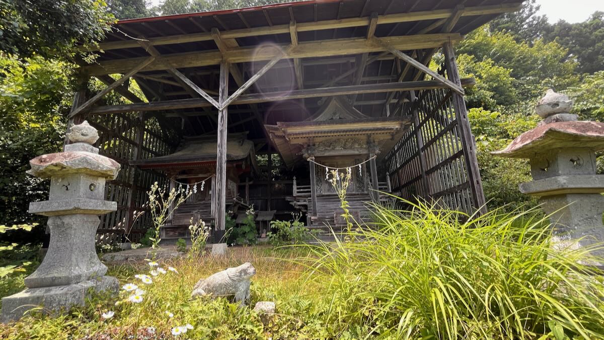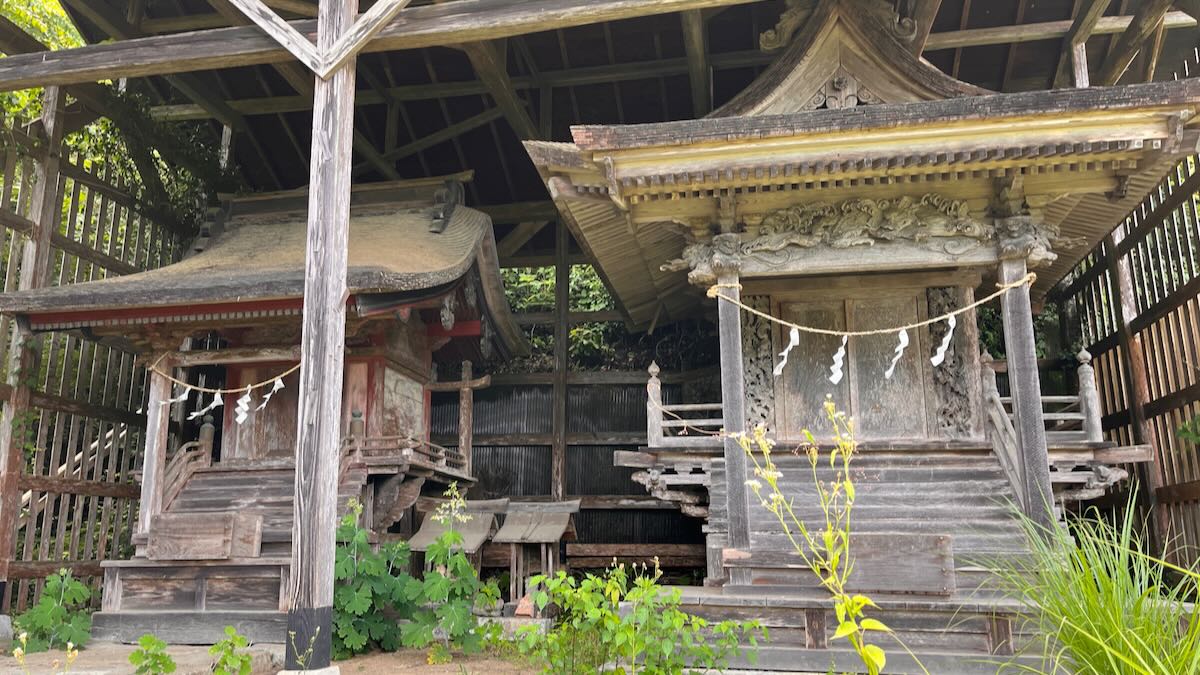 年代不明の風格のある石鳥居の上方に二社見える。石燈籠に「奉納常夜燈兩社御宝前」と両社の文字が彫られているので熊野神社ともう一つ名前の分からない社が祀られている。右手の熊野神社本殿の彫刻は見ごたえがある。