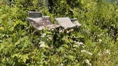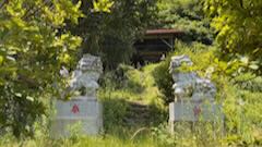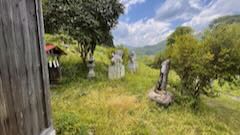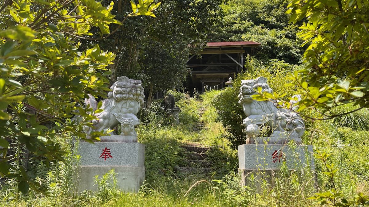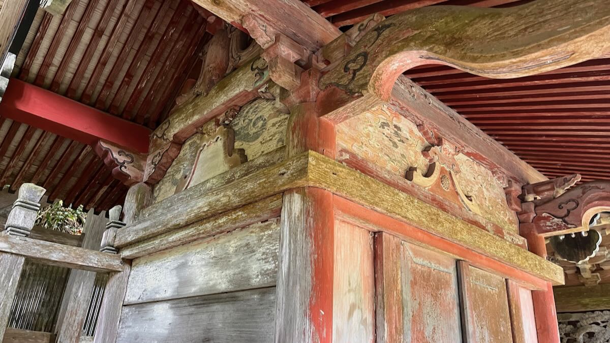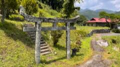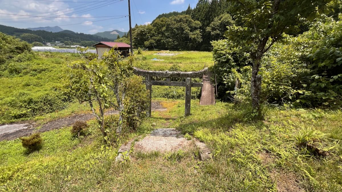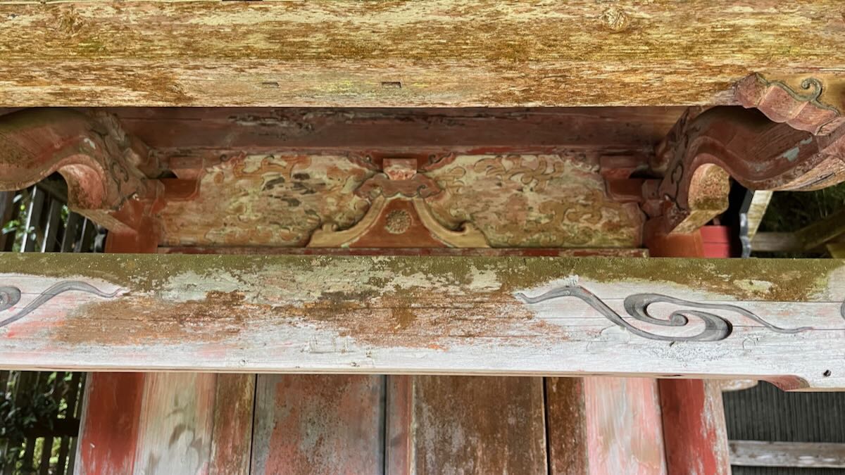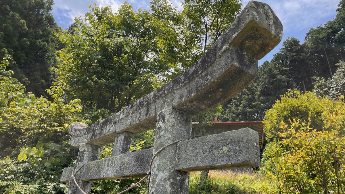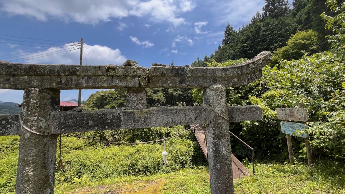 年代不明の風格のある石鳥居の上方に二社見える。石燈籠に「奉納常夜燈兩社御宝前」と両社の文字が彫られているので熊野神社ともう一つ名前の分からない社が祀られている。右手の熊野神社本殿の彫刻は見ごたえがある。