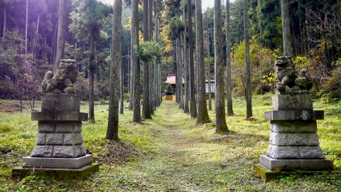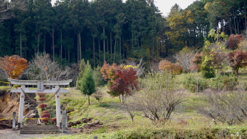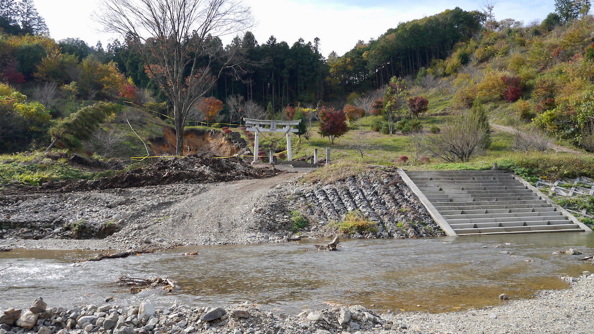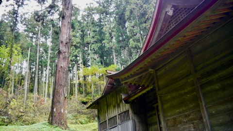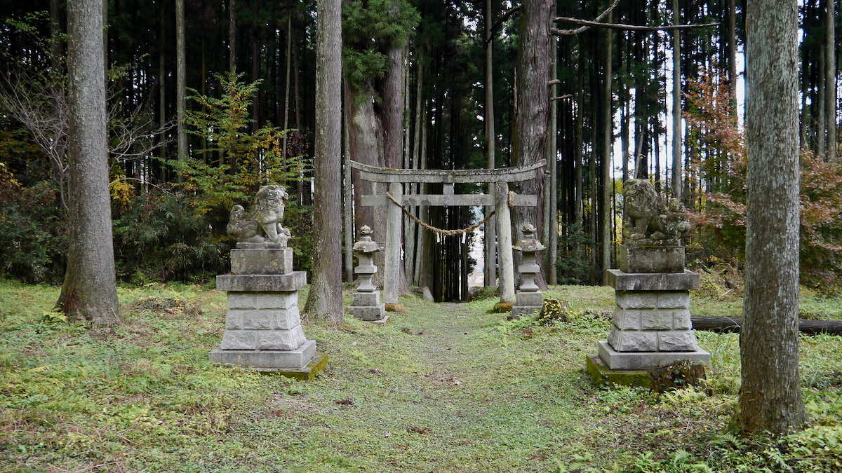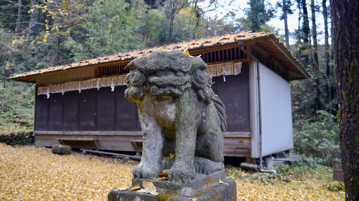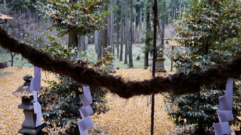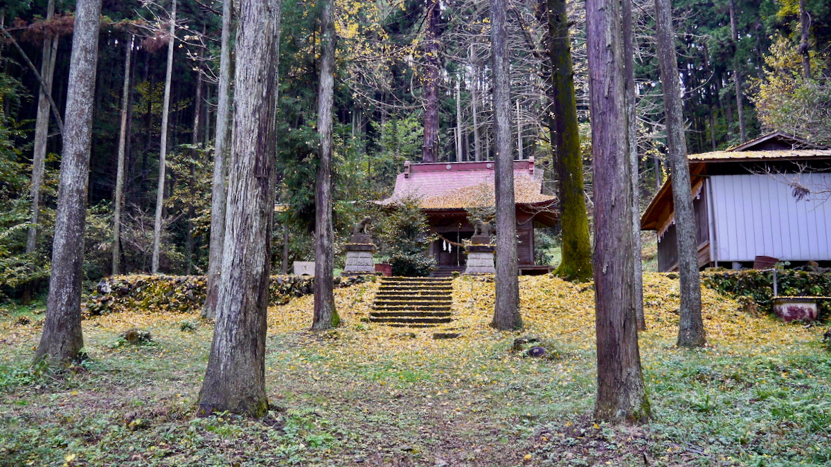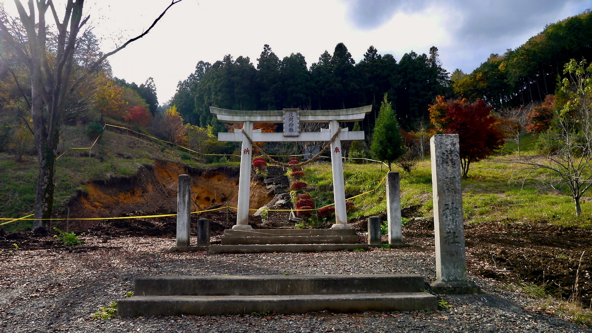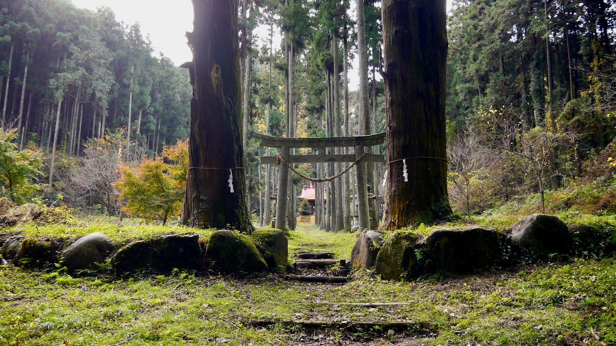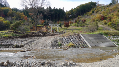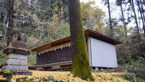 2015年11月16日の時点で鳥居左手の崖が10月の大雨で崩落し,付近は黄色いテープで囲まれて立ち入り禁止になっていた。神社には右手の坂から回り込んで参拝できる。鳥居手前に川が流れており,徒歩では渡れないので無理やり車で渡ってしまった。付近の方のお話しでは通常はほとんど水はないらしい。前日の雨で水位が上がったのだという。例祭時には臨時に橋が架けられる。