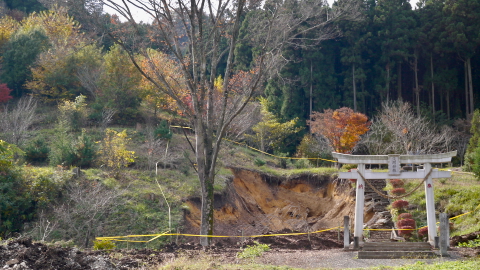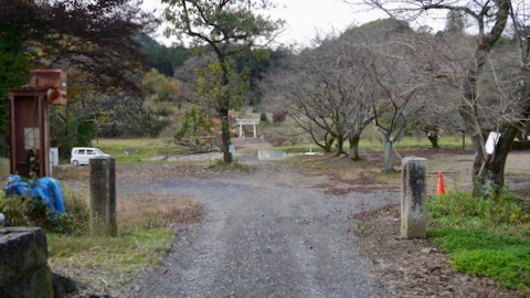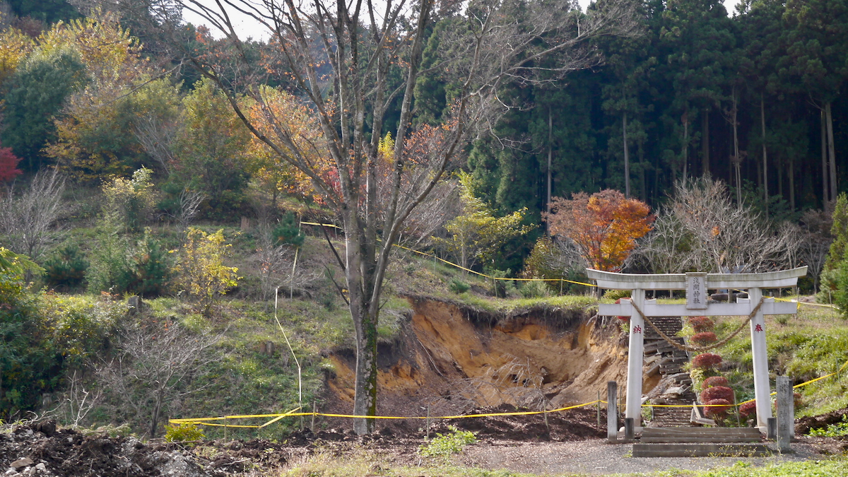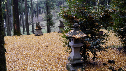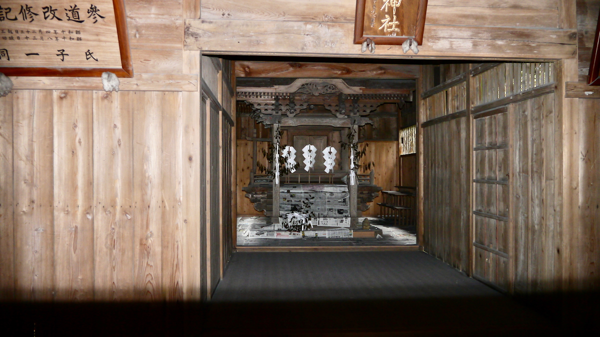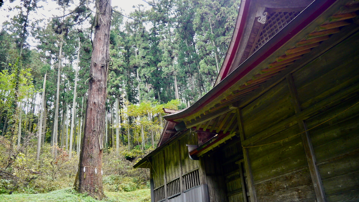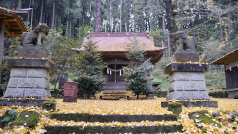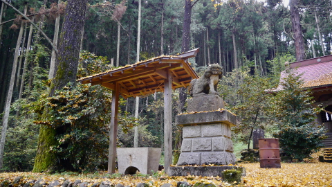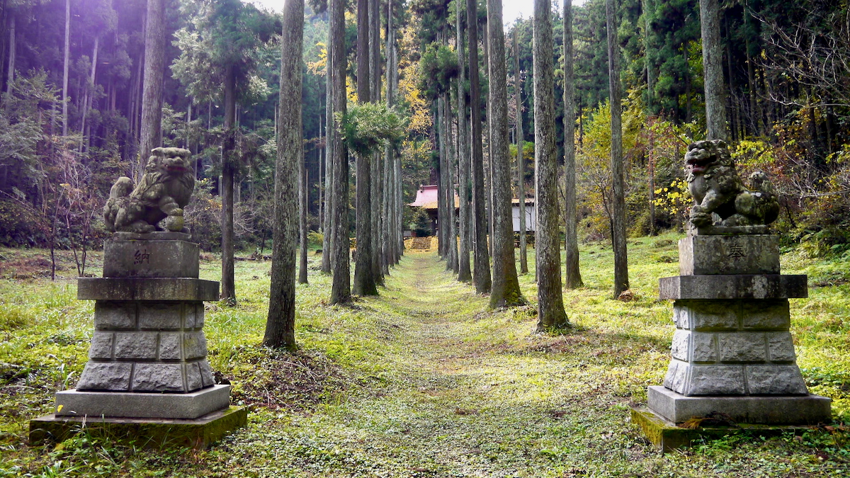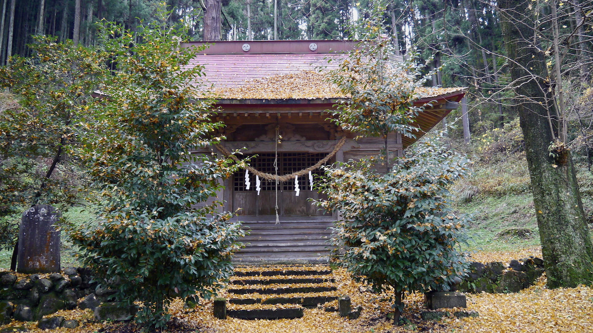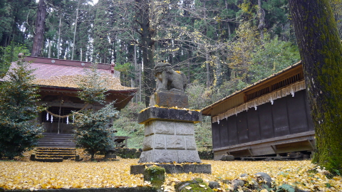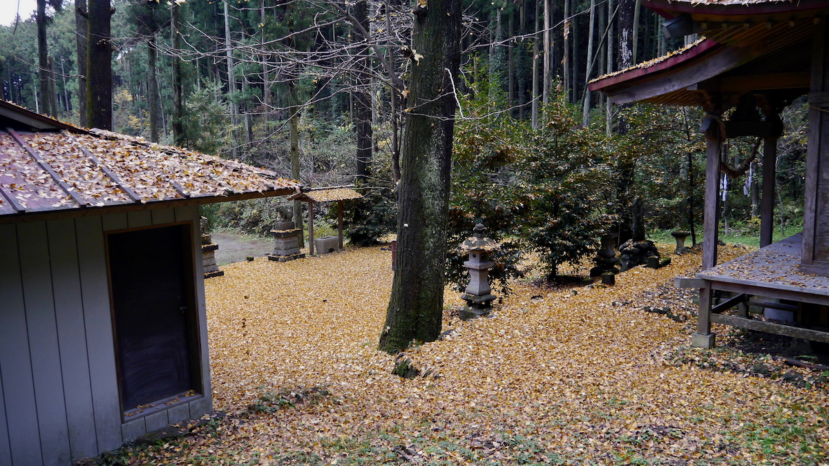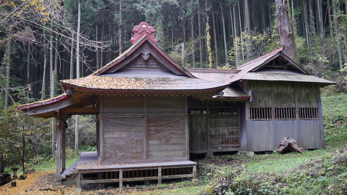2015年11月16日の時点で鳥居左手の崖が10月の大雨で崩落し,付近は黄色いテープで囲まれて立ち入り禁止になっていた。神社には右手の坂から回り込んで参拝できる。鳥居手前に川が流れており,徒歩では渡れないので無理やり車で渡ってしまった。付近の方のお話しでは通常はほとんど水はないらしい。前日の雨で水位が上がったのだという。例祭時には臨時に橋が架けられる。