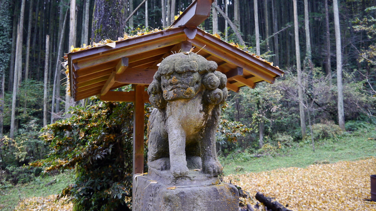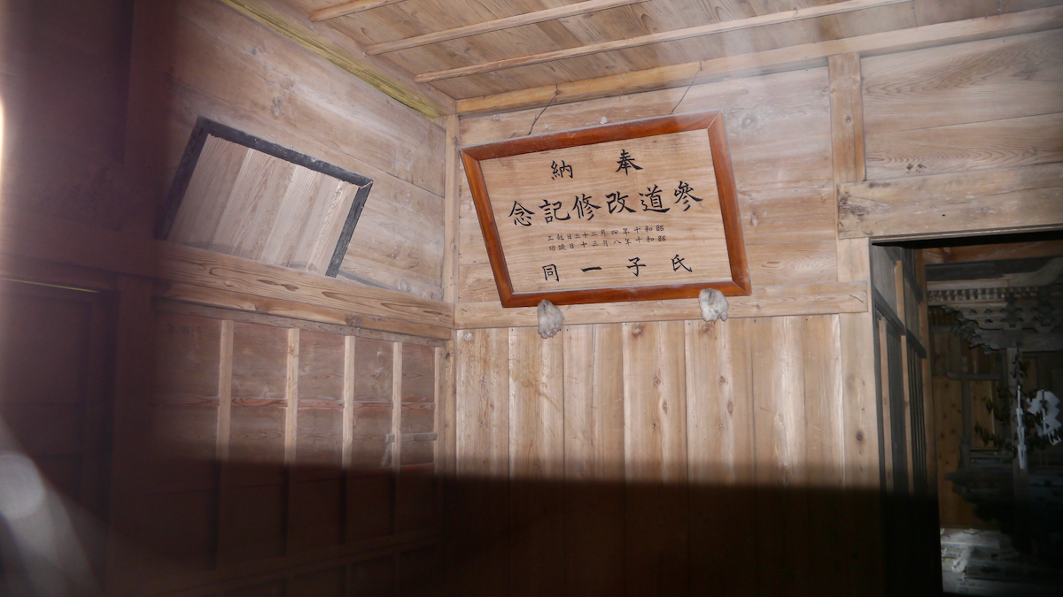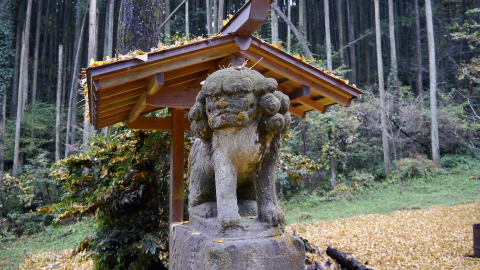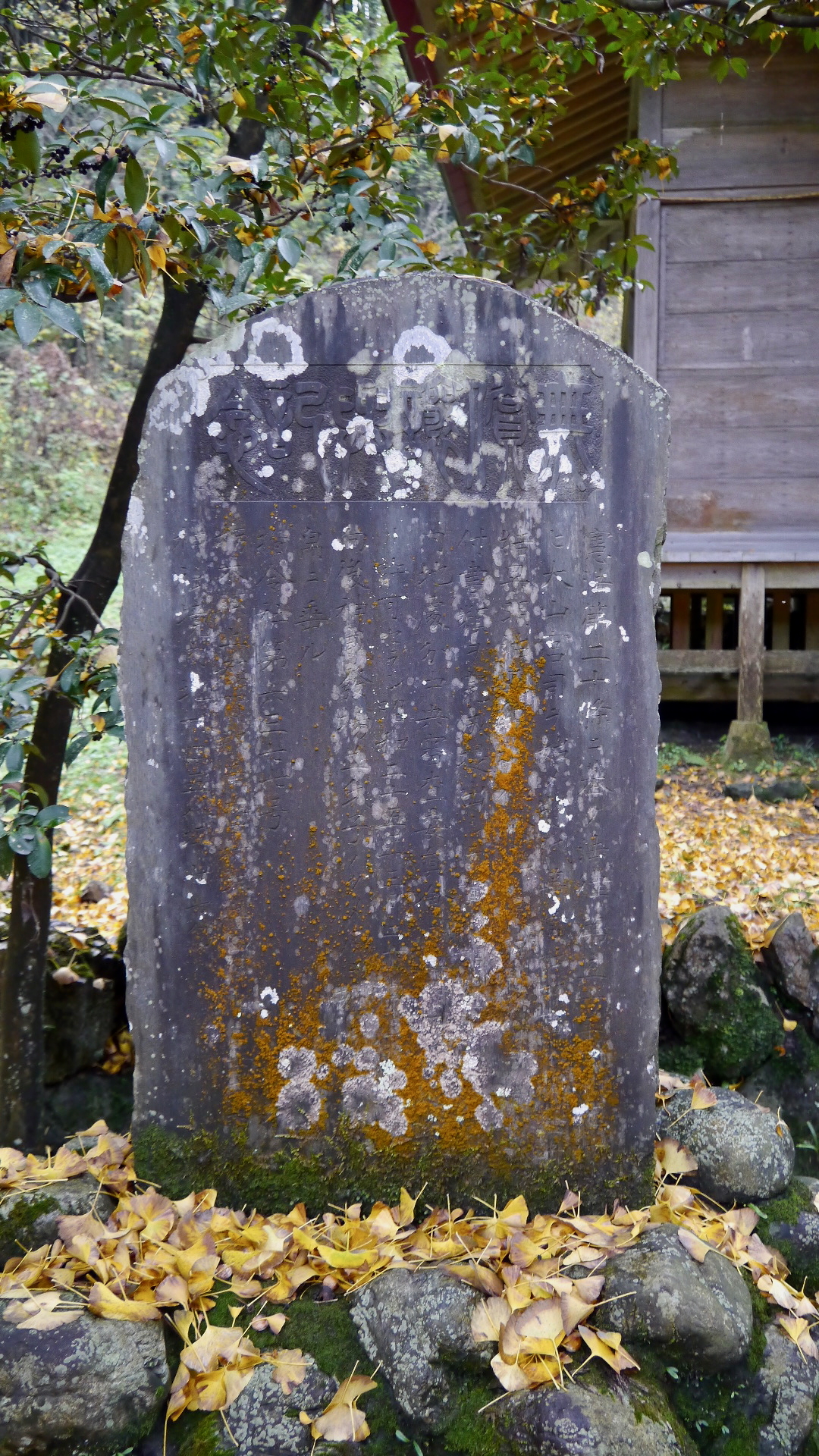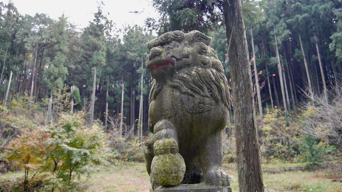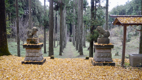 坂を登って行くと杉林に入り,奥に二の鳥居が見える。額束に「安永三年1774西沢村總氏子甲午十一月吉日」と刻まれている。鳥居足許には明治四十一年1908石燈籠,つぎに昭和十七年1942狛犬。手水舎の脇に元治元甲子1864狛犬。なかなかの面構え。一基は台座が一度覆われて修復されたらしい。