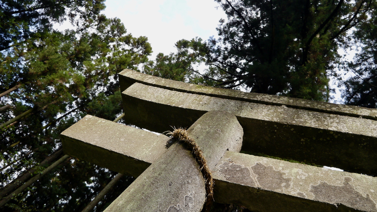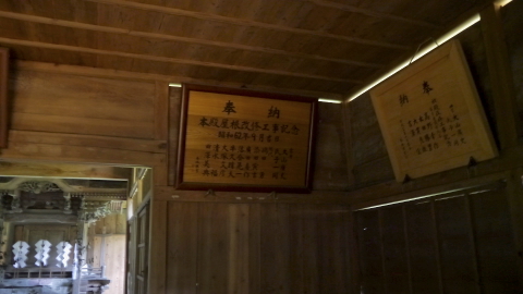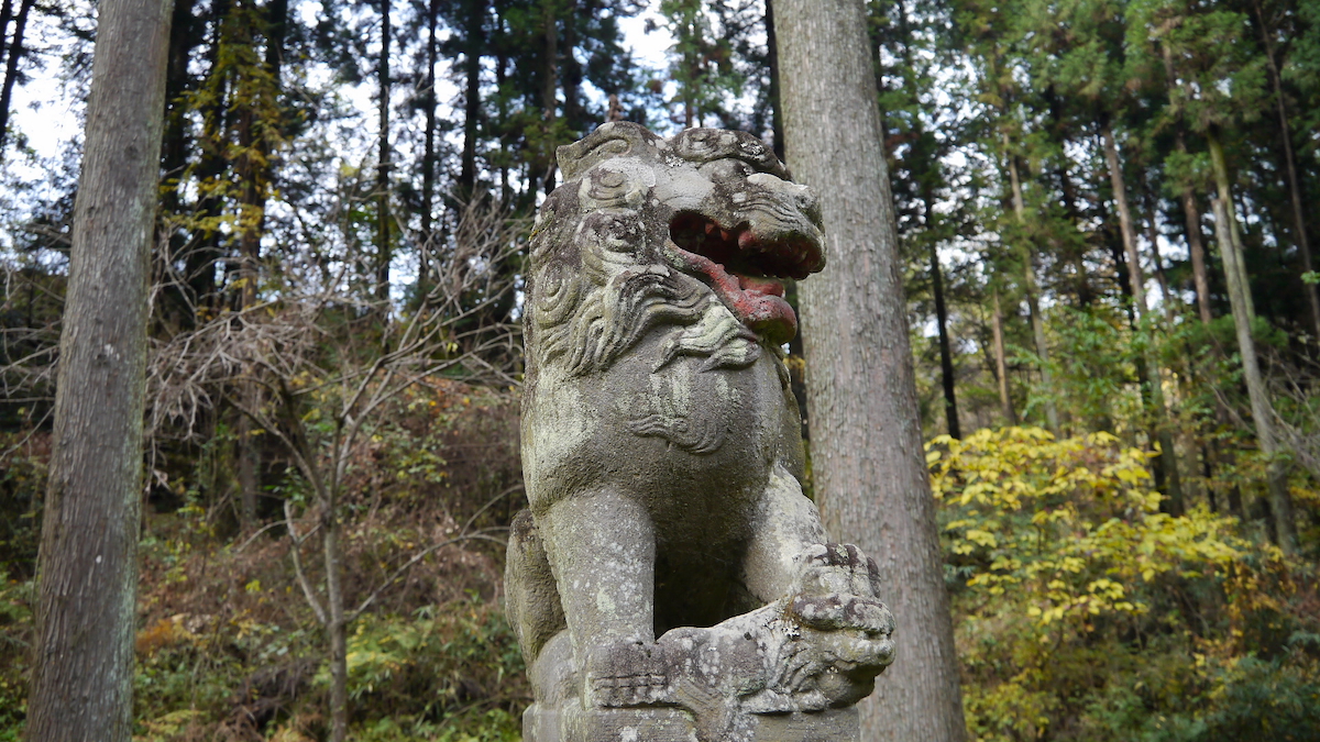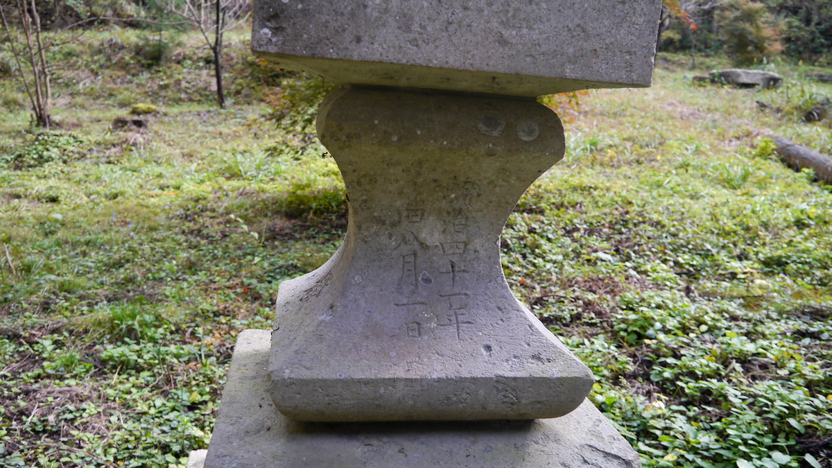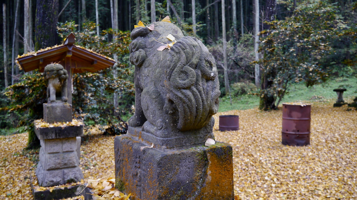 坂を登って行くと杉林に入り,奥に二の鳥居が見える。額束に「安永三年1774西沢村總氏子甲午十一月吉日」と刻まれている。鳥居足許には明治四十一年1908石燈籠,つぎに昭和十七年1942狛犬。手水舎の脇に元治元甲子1864狛犬。なかなかの面構え。一基は台座が一度覆われて修復されたらしい。