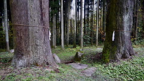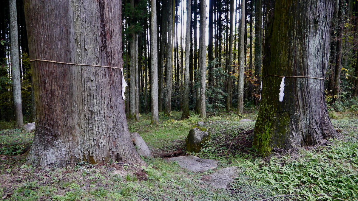 本殿裏手に杉が聳えている。こちらが御神木だろう。二の鳥居手前の杉二本も巨杉だが。 川の側の一の鳥居脇に昭和26年1951社号標。大きな石碑は平成19年9月に建立され「浅間神社合併経緯」が刻まれている。