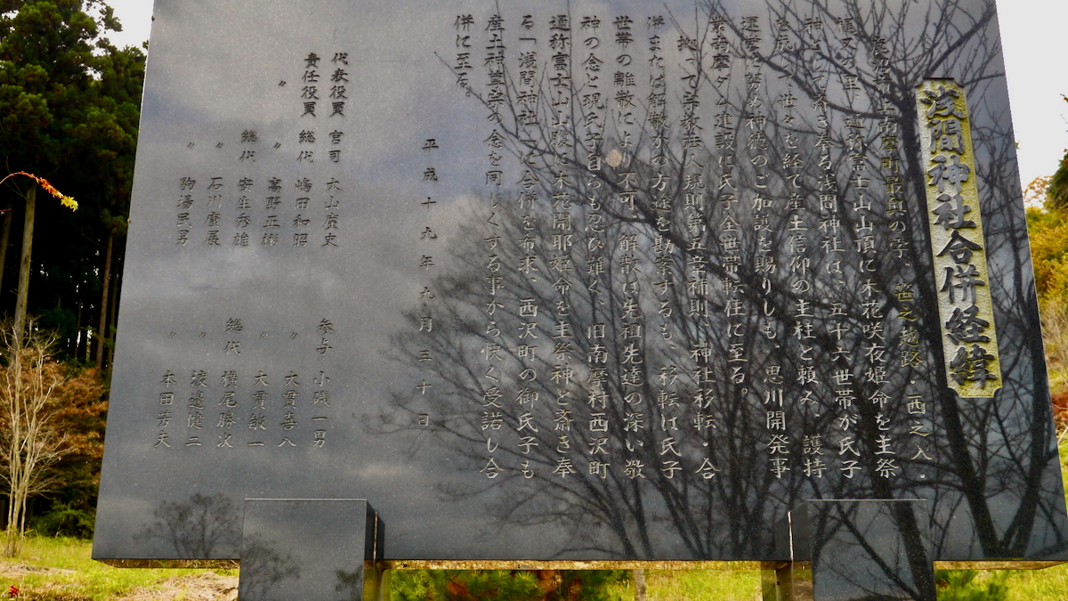 「南摩町最奥の字,笹之越路・西之入・梶町の里,通称富士山山頂に木花咲夜姫命を主祭神として斎き奉る浅間神社は,五十六世帯が氏子を成して世々を経て産土信仰の主柱と頼み,護持運営に努め神徳のご加護を賜りしも,思川開発事業南摩ダム建設に氏子全世帯移転に至る。拠って宗教法人規則第五章補則,神社移転・合併または解散かの方途を勘案するも,移転は氏子世帯の離散により不可,解散は先祖先達の深い敬神の念と現氏子自らも忍び難く,旧南摩村西沢町通称富士山山腹に木花開耶姫命を主祭神と斎き奉る「浅間神社」に合併を希求,西沢町の御氏子も産土神尊崇の念を同じくする事から快く受諾し合併に至る。」