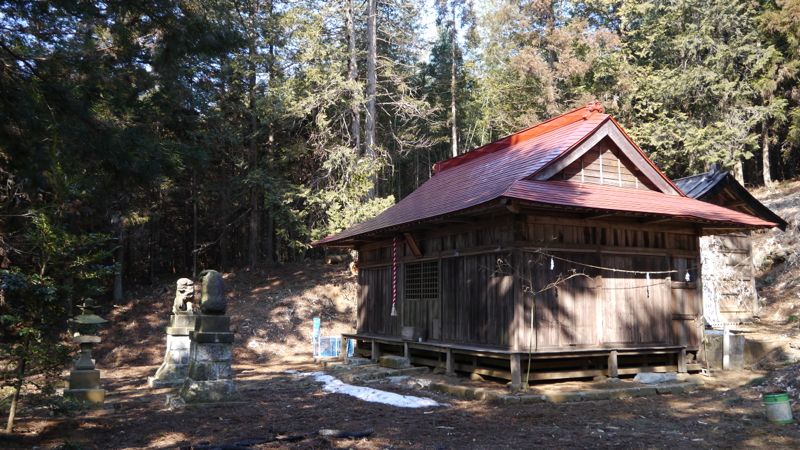 右手に愛宕神社と稲荷神社の石祠。左手に富士神社と浅間神社がひとつに祀られた木製祠と不明の石祠。昭和三年狛犬。 朱鳥元年686の創立といわれるので,要は創建不詳の古い神社。文政八年1825九月再建。昭和22年に修理が行われ,大社造の萱葺が昭和50年代にトタン葺きに改修されている。