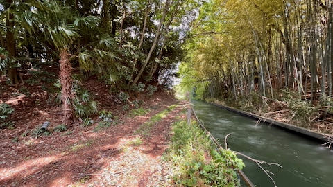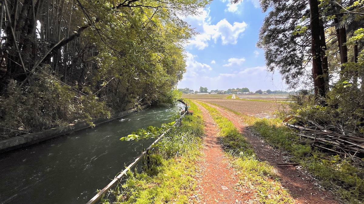 前方後円墳の後円部分頂上に鎭座。見下ろすとけっこうな高さがある。脇を豊富な水量の用水が流れている。