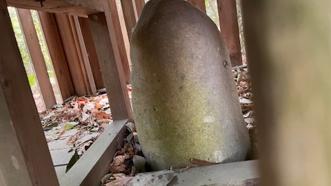 平成二十一年石鳥居。その左手に正徳五年1715阿闍梨仏塔,宝永六年1709十九夜念佛など多数。創建前から村落の聖地であった。