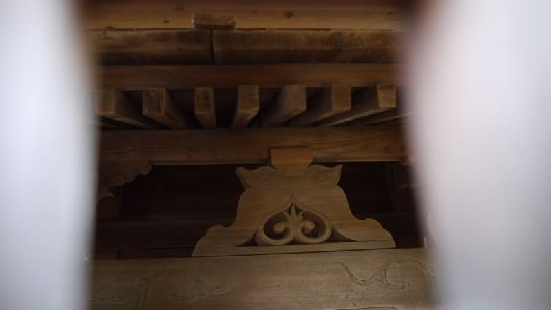本殿左手に「奉再建日天社村○○」大正期の神札が見える。