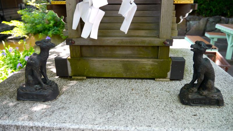 本殿右手に銭洗の瀧があり,柄杓の先の籠に紙幣貨幣を入れて小滝で洗うと金運が高まる。朱色の鳥居が見え,「銭洗社」の木製祠。その右手塀に遮られて冠木門に「市神社」