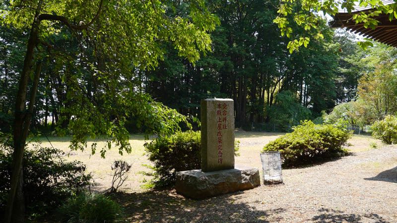 昭和五十六年1981拝殿新築記念碑。平成十年1998本殿上屋改築記念碑。平成二年樅の木奉納額。