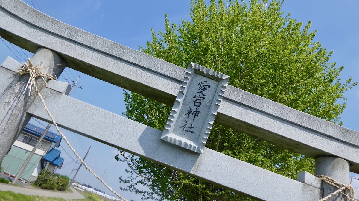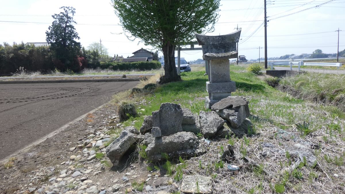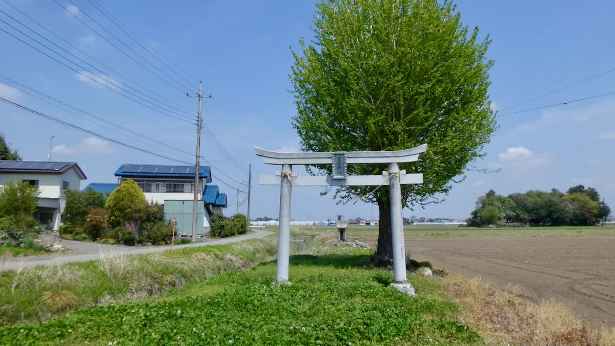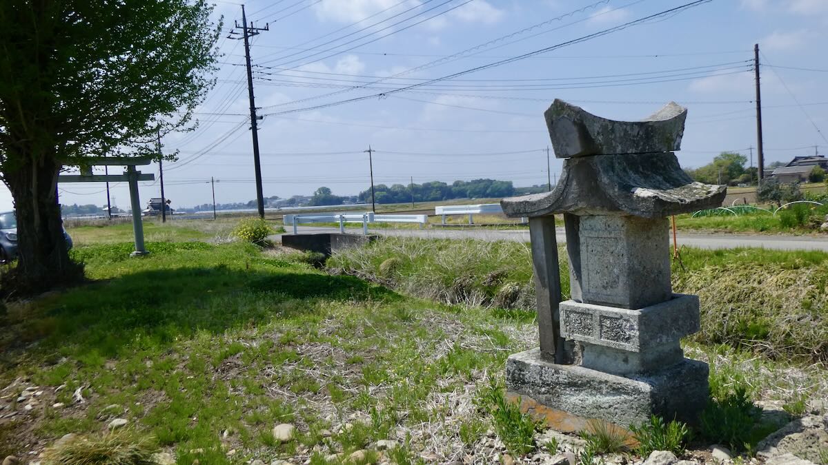 水橋街道156号線西の沖渋川観音堂南の田の中に鎭座。本殿背後に旧本殿石材が保存されている。平成十九年2007石鳥居。