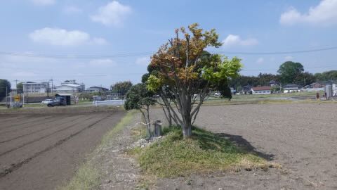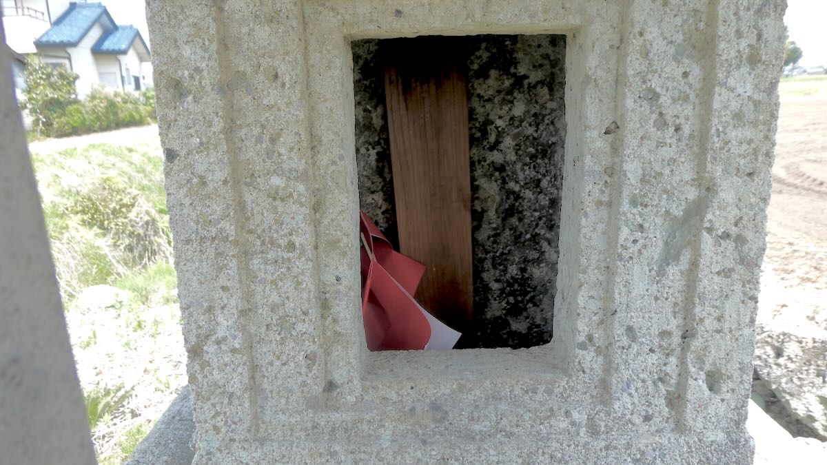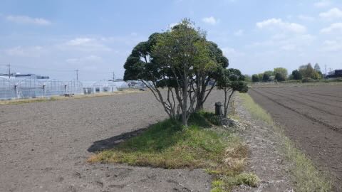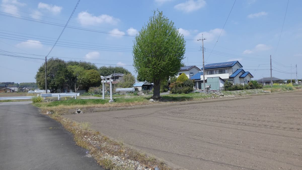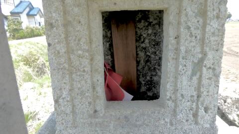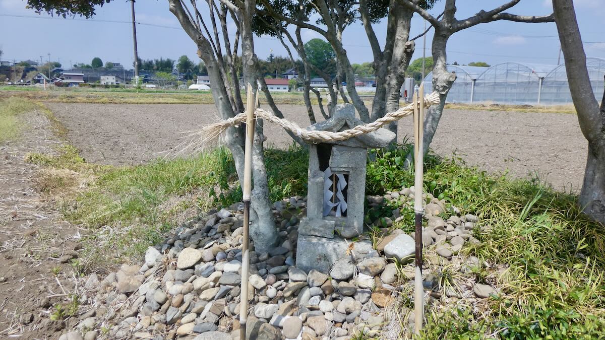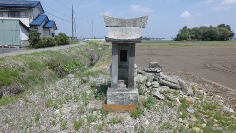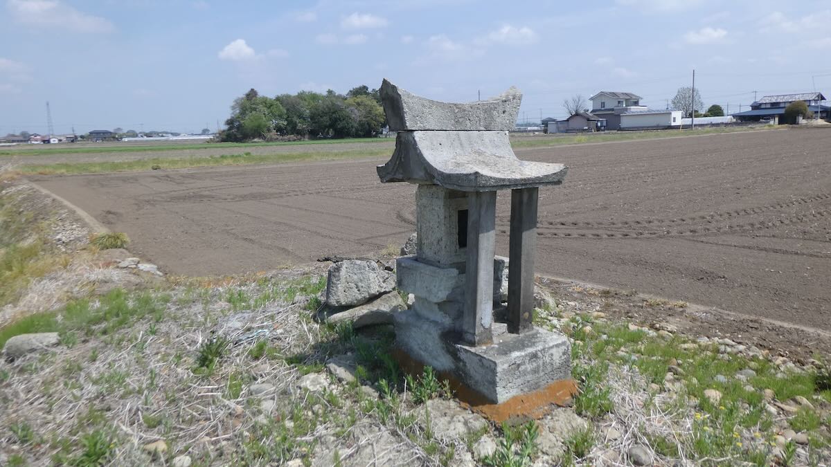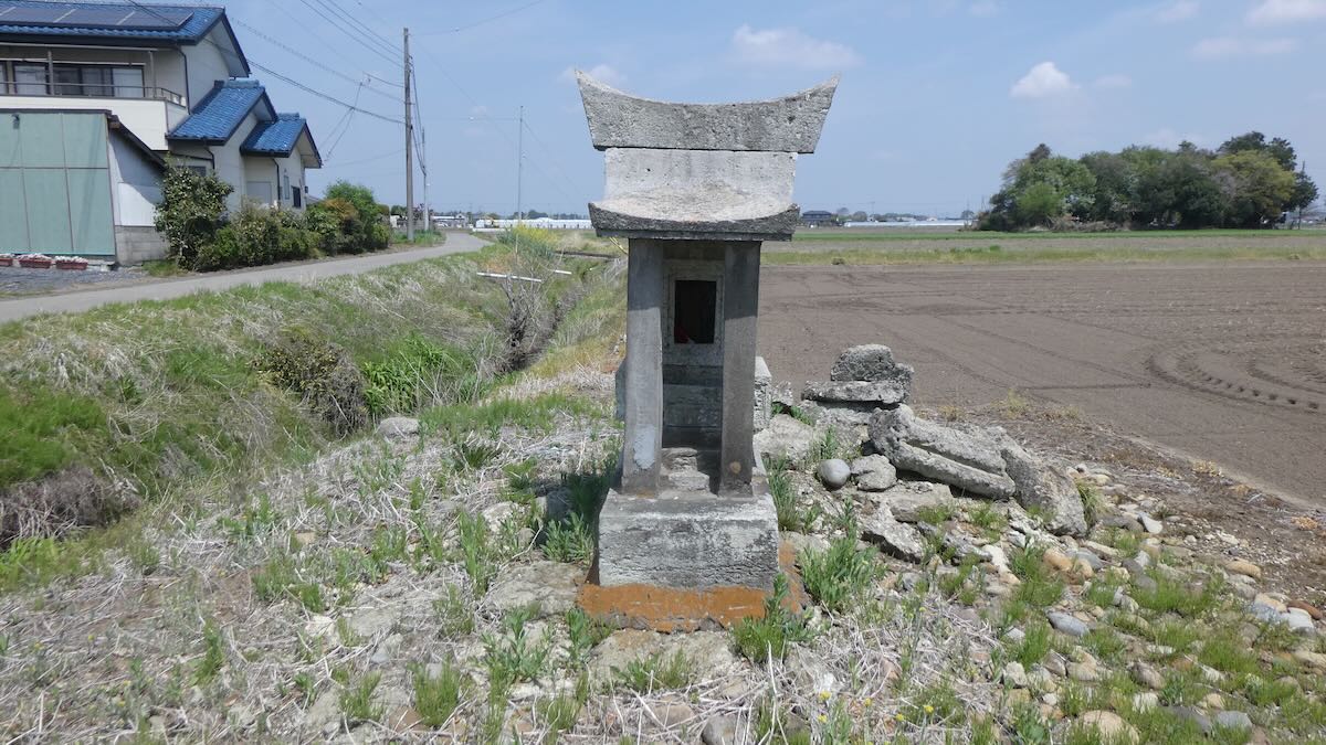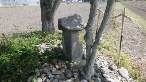 南に約1キロ,農免街道が宇都宮街道に突き当たる手前の熊倉町の田の中にも石祠が祀られている。