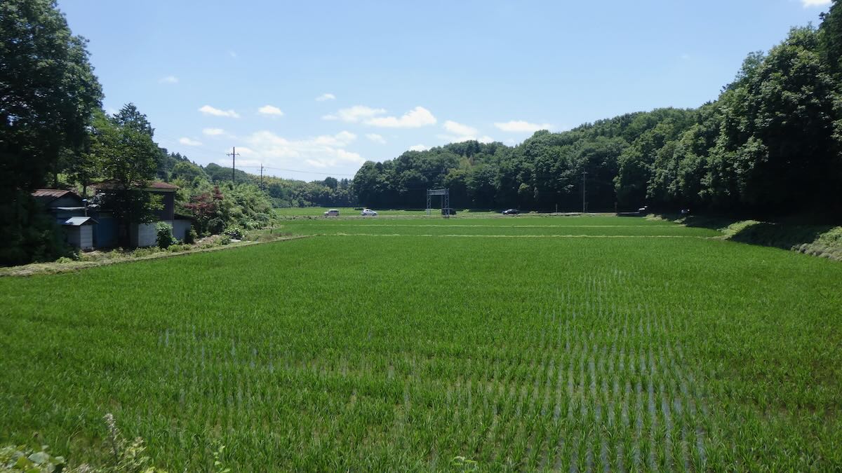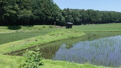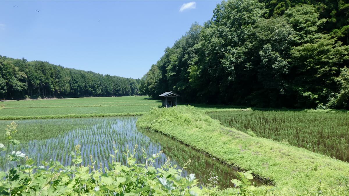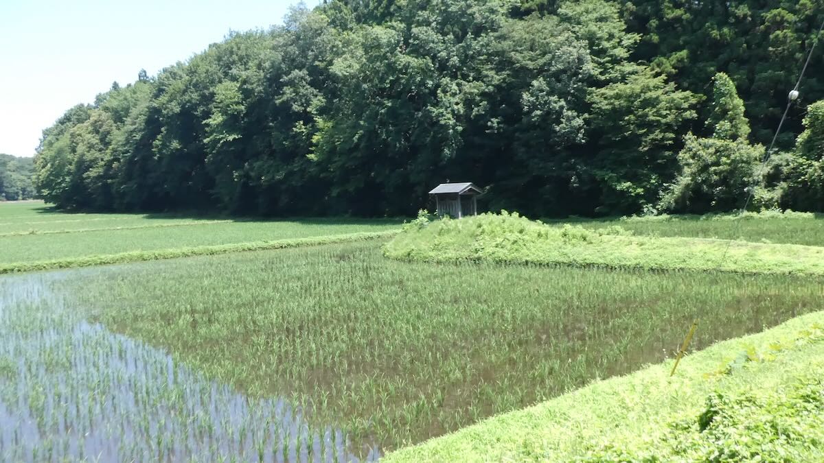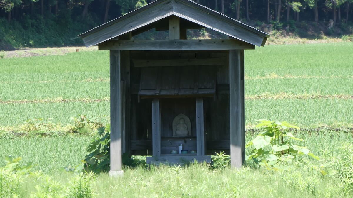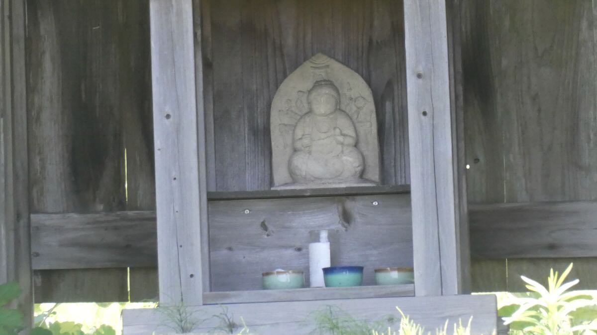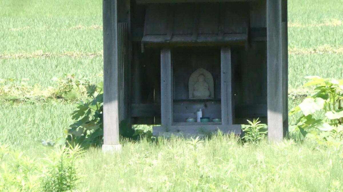 道路から田に向かって突出して築かれた堤に木製祠が鎮座。不空羂索観音?石像が祀られている。すばらしいロケーション。