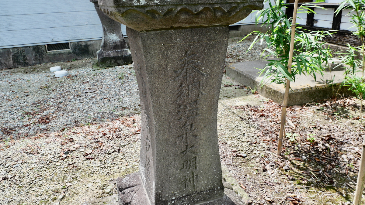 本殿前左手の天明七丁未歳1787の石燈籠に「湯泉大明神」と彫られている。