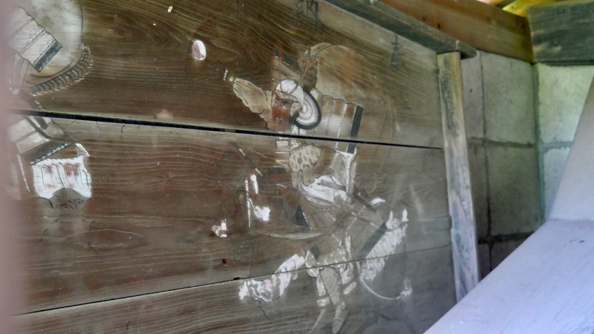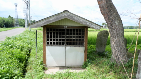 詳しいことは分からない。覆屋内に木製祠,狩野村大字井口鎮座・奉生駒神▢が読める。左手に奉納御寶前絵馬。西那須野地区で一番古い200年以上前の絵馬で文化八年1811奉納,野川守盈作。