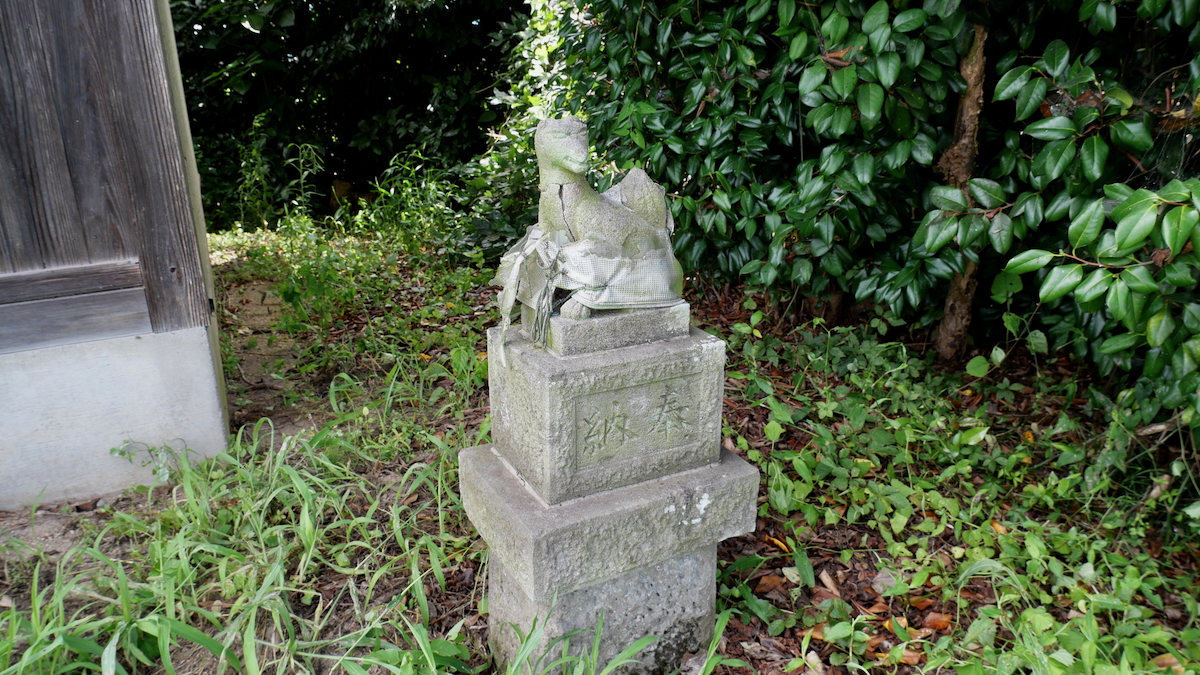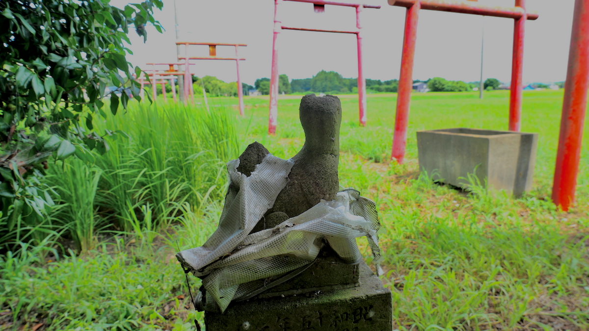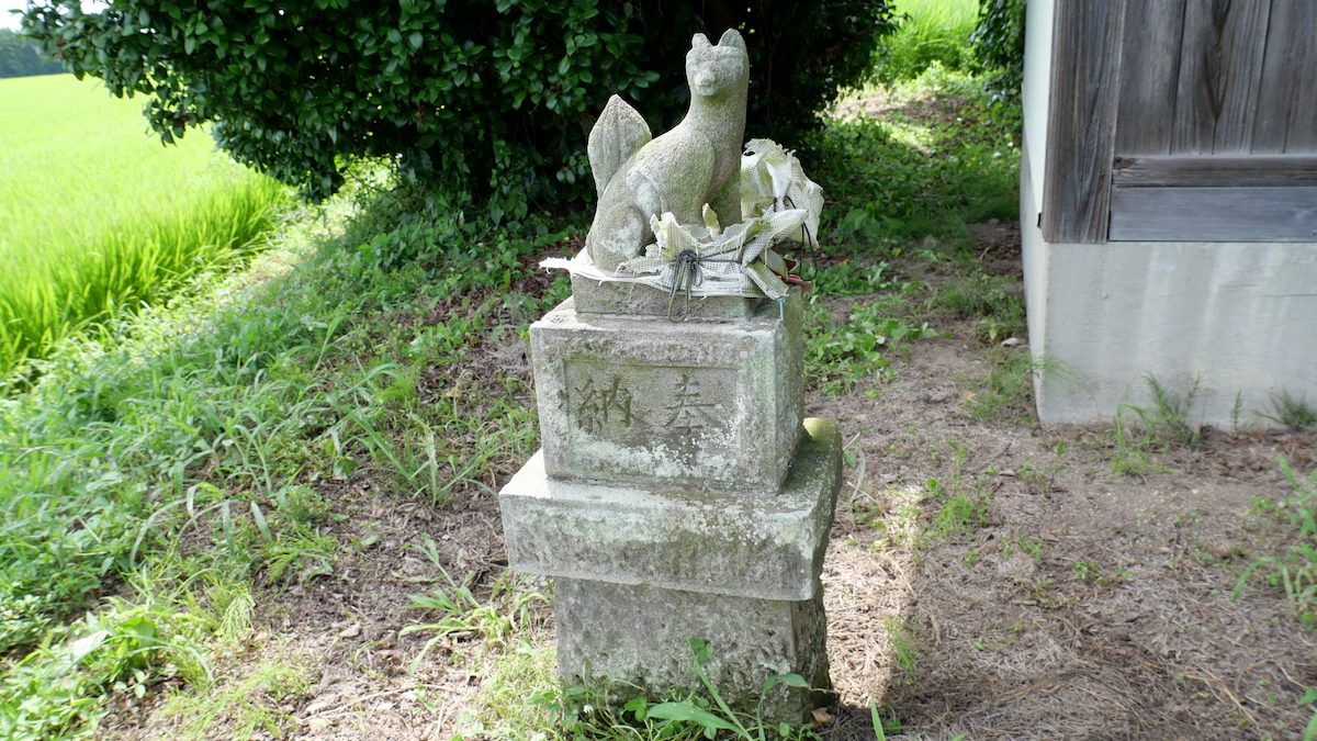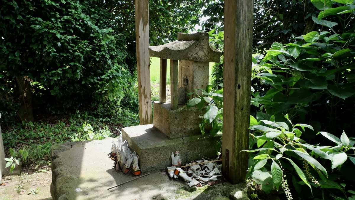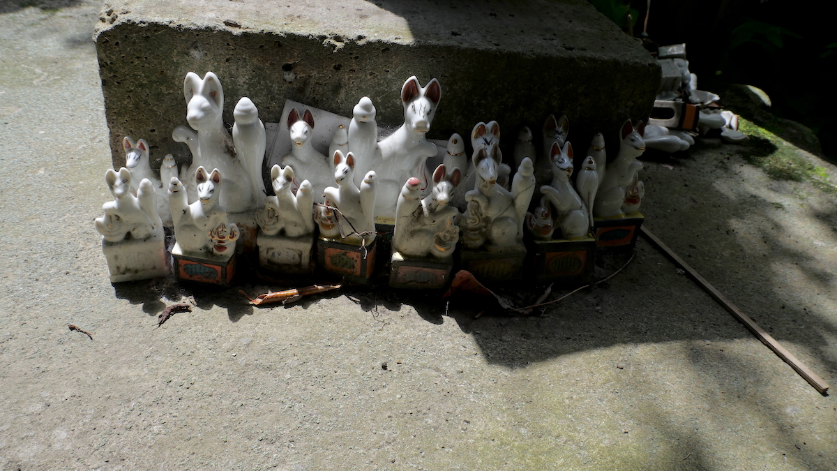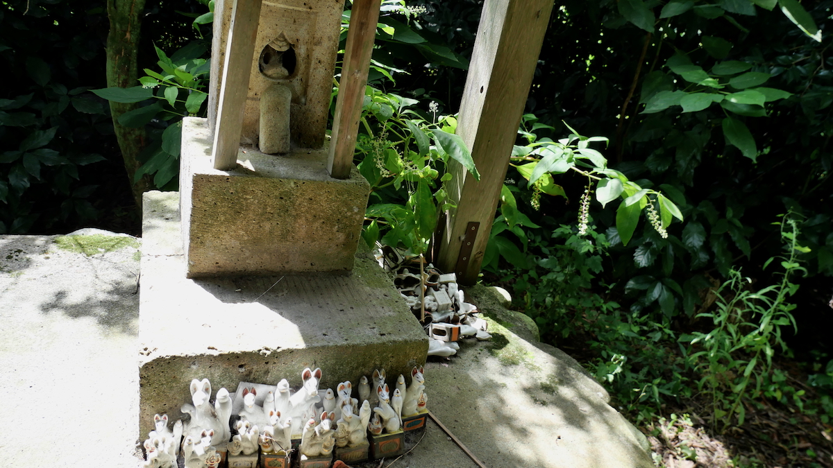 覆屋背後の石宮がご本殿。焼き物のおキツネさんが多数そなえられている。
