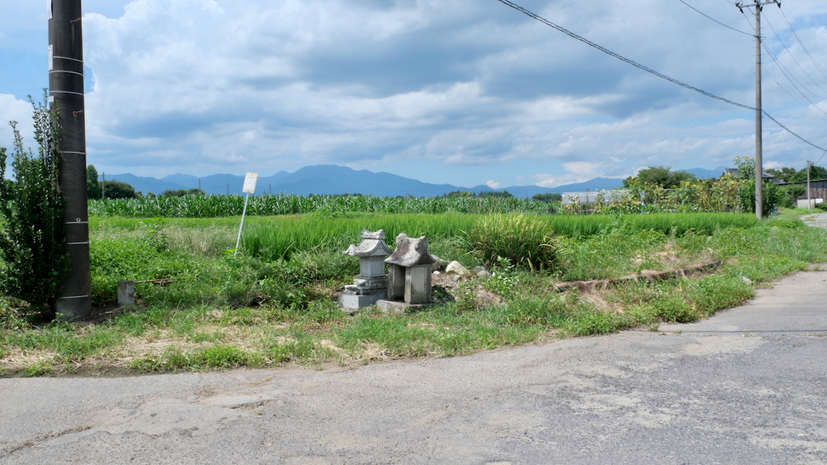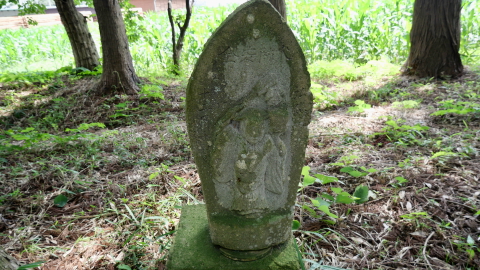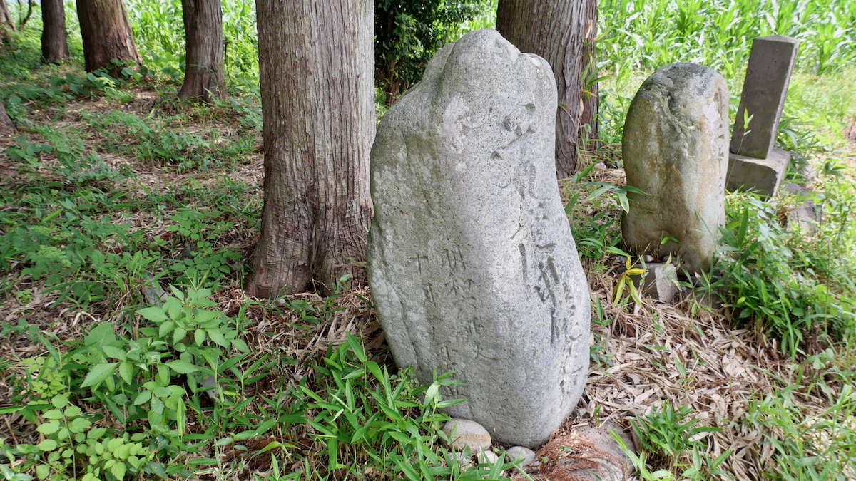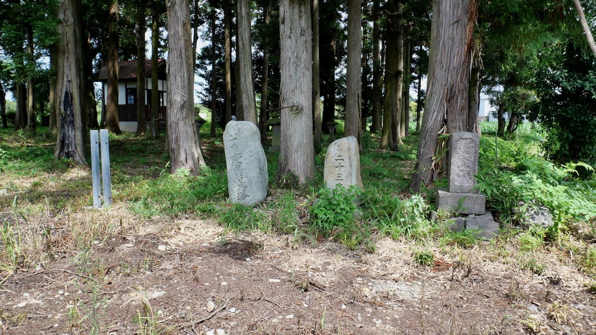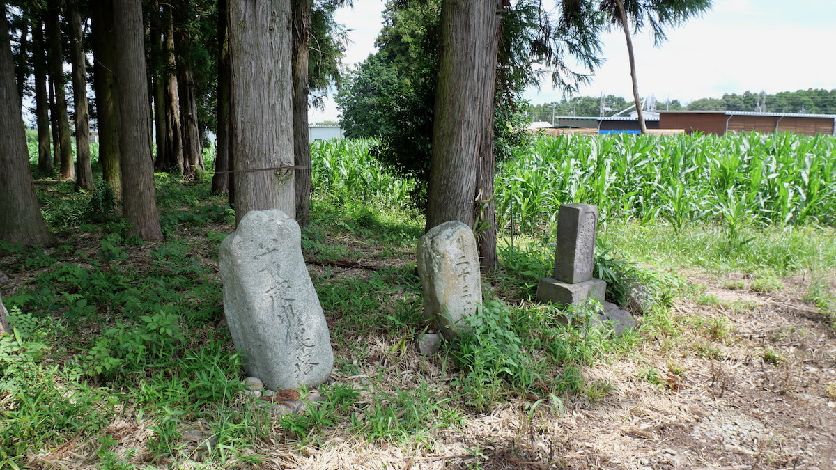 入口左端は「明和六丑天1769庚申供養塔」,中央は「文政六未年1823二十三夜塔」,右端は殆ど読めないが「明治七甲戌年1874大山阿夫利神」,台座に井口村,槻沢村の文字。
