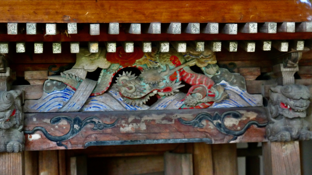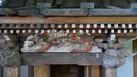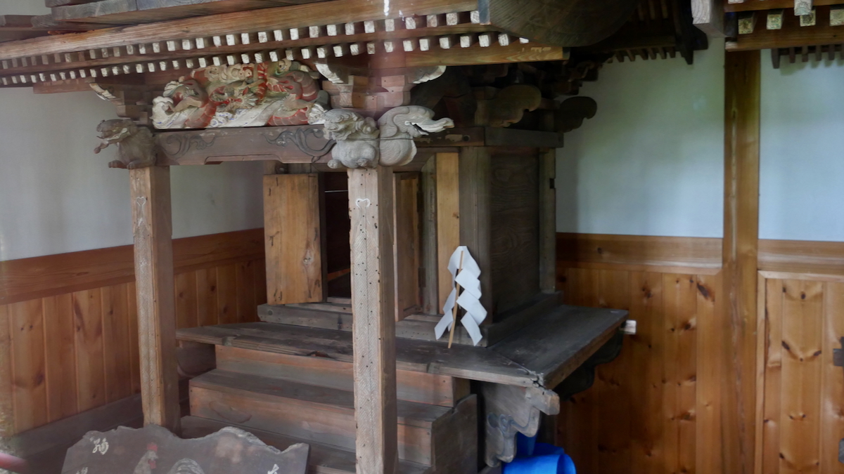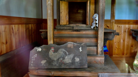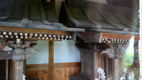覆屋内右手の宮に陶製ニワトリ狛犬が奉納されているので,こちらが鶏鳥神社,すると左手の祠が温泉神社か。ほとんどウリふたつの木製祠。