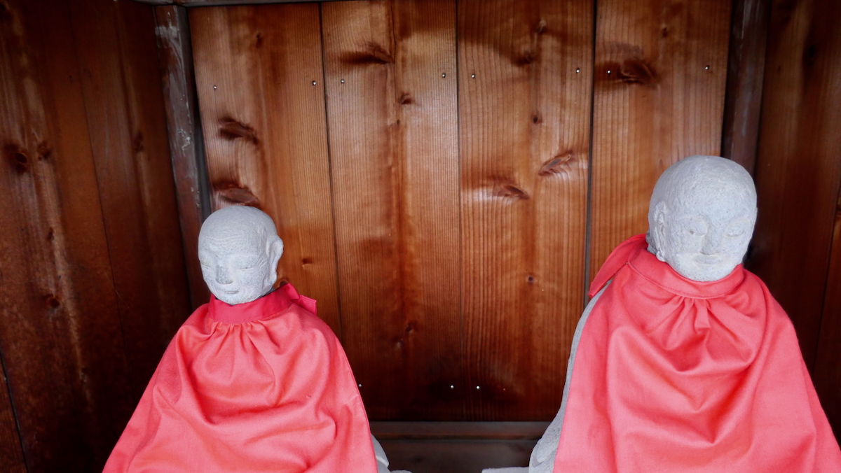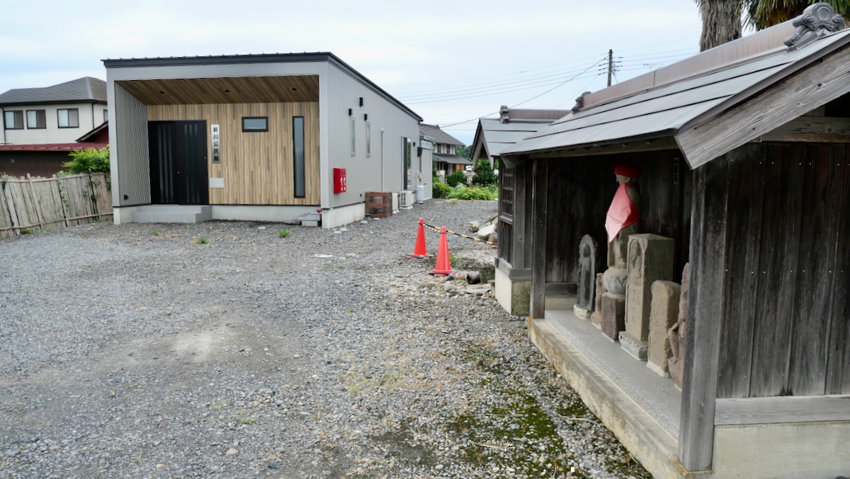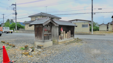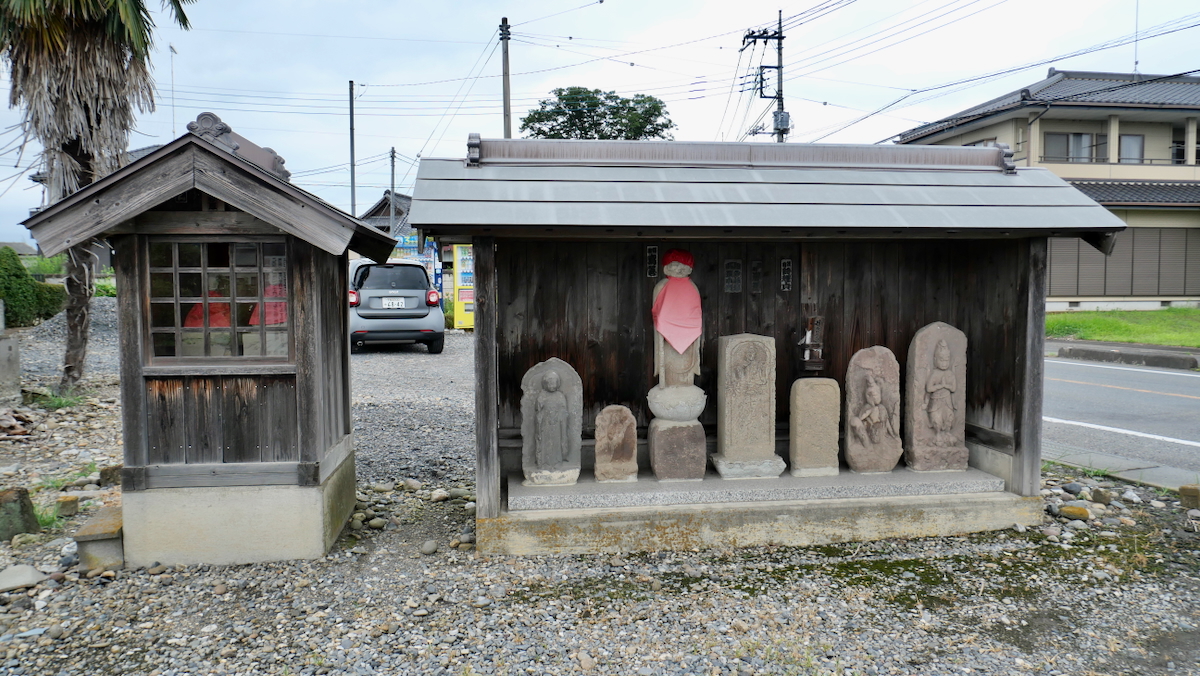 その隣りの覆屋には朱色衣の地蔵尊らしき石像二体。197坪。