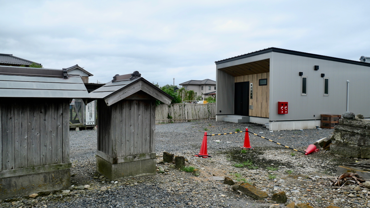 『栃木県神社誌』昭和39年版には間口0.2間石宮の記録がある。新川公民館は新築されていて拜殿のおもかげはない(2025/7月撮影)。右手前に地蔵尊など7基が保存されている。
