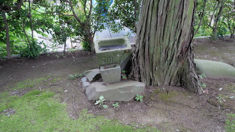 昭和四十七年1972石鳥居。石宮四基。鳥居の先右手のコンクリート土台に古そうな石像が保存されている。延享元甲子1744法印權大なんとか,宝永八辛卯天1711權大僧都法印なんとか,推定享保十五庚戌天1730權大なんとか,推読享保二年1717權大僧都法印なんとか。