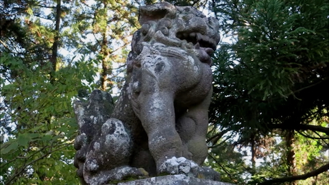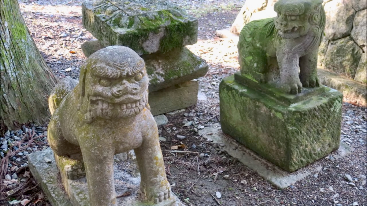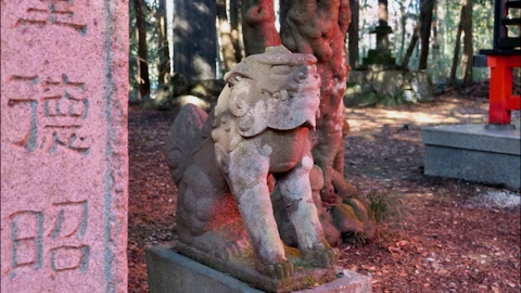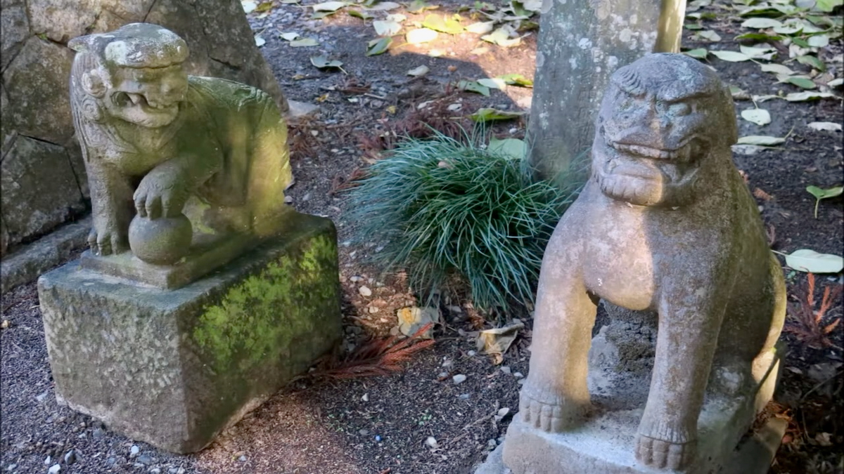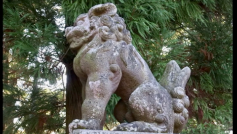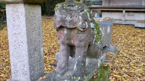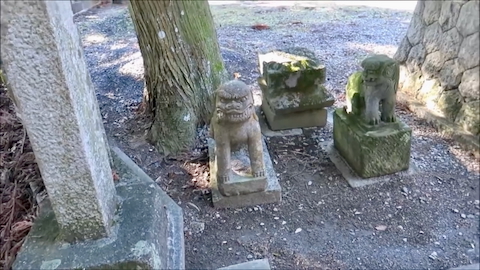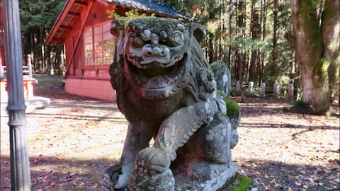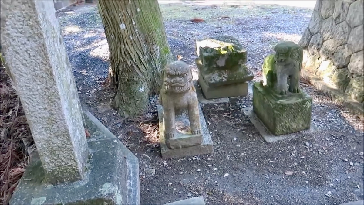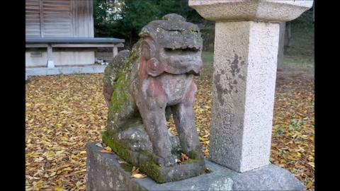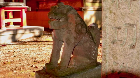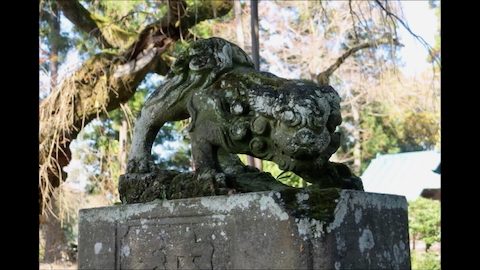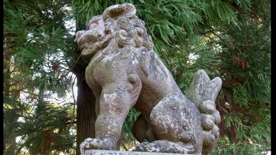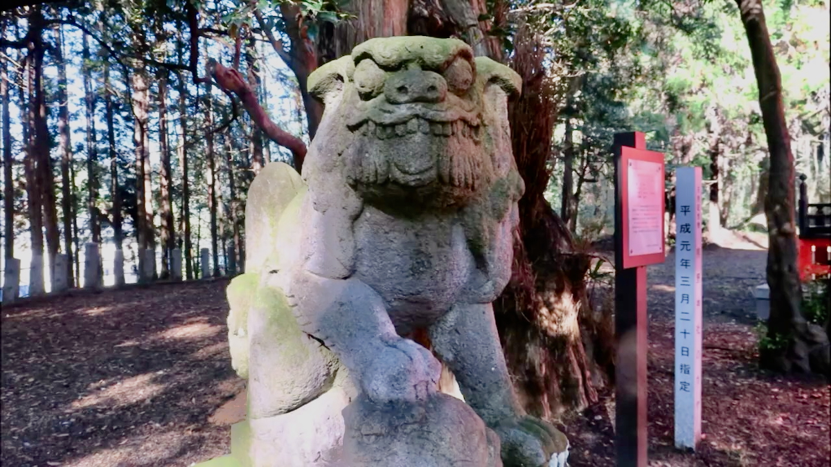 (以下細字)/此社につきいと珍らしき話柄あれは掲くへし頃は文久二年1862三月十八日折しも西風烈しく樹枝を折り砂を飛ばす程なりしか何れよのか火は熾んに燃へ來りて神主阿部家は勿論本社拜殿にまてみるみる燃へうつりたり風急なれば人々防くに術なくあれよあれよと眺むるのみ時に阿部氏は不在にて夫人ツヤ子のみ必死となりて奴僕を指揮し器具財物等を運び出さんと猛火の傍りを往來せる時何地より來りけん一匹の唐犬常にツヤ子に随ひて奔走し其傍を離れす其時は危危の塲合とて心にもとめさりしか程すぎて鎭火の後考へみるに飛騨の甚五郎が作なる木狗は嘗てより本社に納めありしが定めて名人の細工とて魂のこもり居ることゆへ神の惜しませたまいしにやと思いつき阿部氏歸宅の後此ことをはなせりにさもありなんとて氏もいたく其災に罹りたるを惜みしと云ふ/