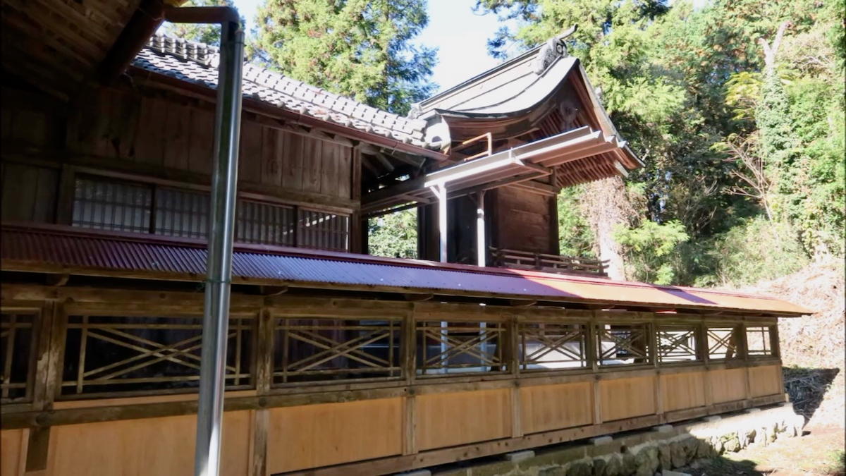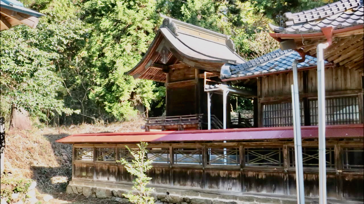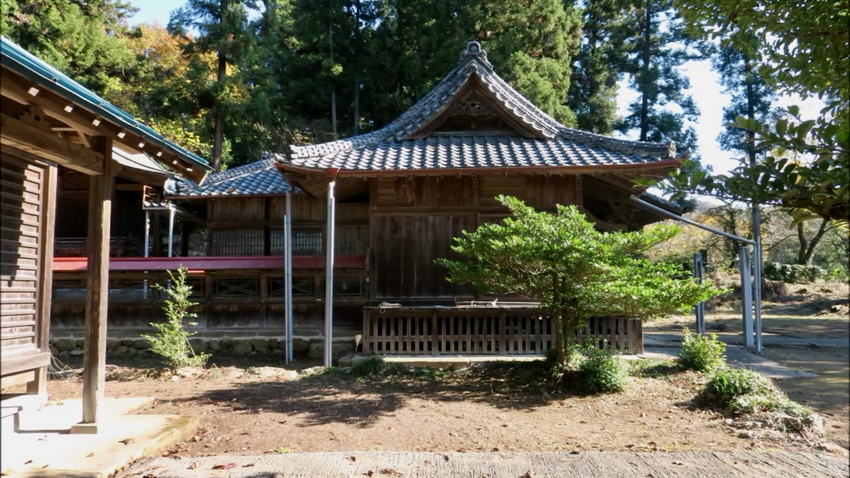 建物本社間口九尺奥行六尺小羽葺 拜殿間口三間半奥行二間半瓦葺 神樂殿間口六間奥行三間半茅葺 石華表一基 境内地千七百三坪本大字の中央平地にあり宮殿は南向きにして四方廣濶人家の點々たるを見る 前は飛駒の流水潺湲として晝夜を舎てず風籟と相和し琴瑟を聞くが如とし 境内には杉檜樫の大木あり緑り濃やかに適ま異禽の喈聲を弄するあり眞に耳目を爽やかならしむる別乾坤なり