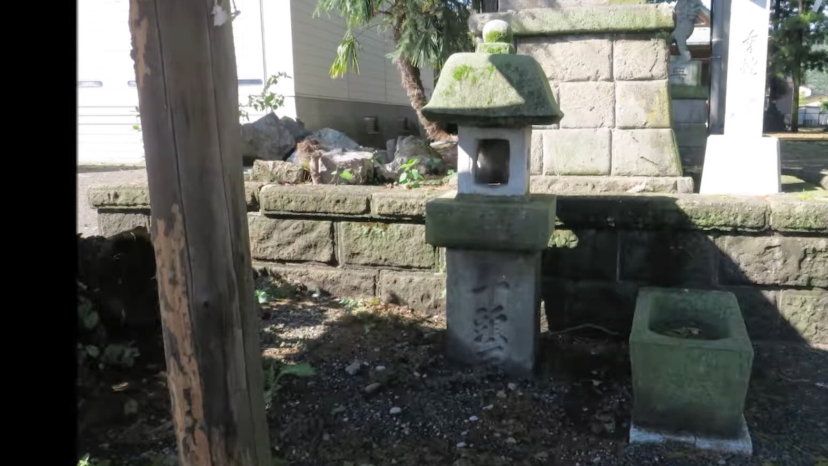 境内社として記録されている「八坂神社,浅間神社,菅原神社,秋葉神社」のどれか不明だが,拝殿右手の石垣に2社並んでいる。「x納xx三社xx xxxx丁卯」だけ読める石燈籠が2基。
