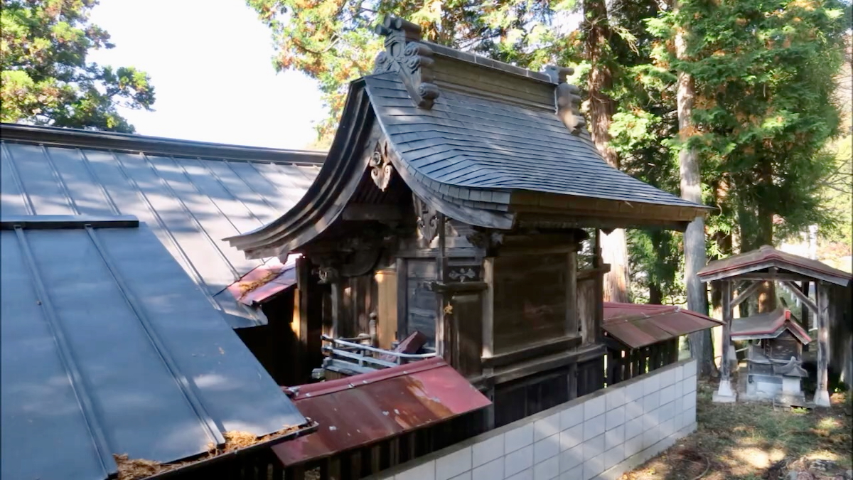 建物 本社間口九尺奥行一間栃葺 幣殿間口九尺奥行一間 拜殿間口三間奥行二間 前殿間口六間奥行三間萱葺 鳥居一基 石燈籠二基 末社八社 氏子五十戸惣代龜山幸吉外三員 社掌影山志善仝村大字仝十九番地住