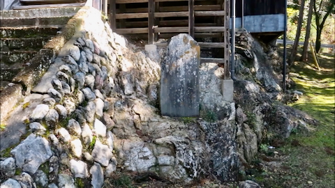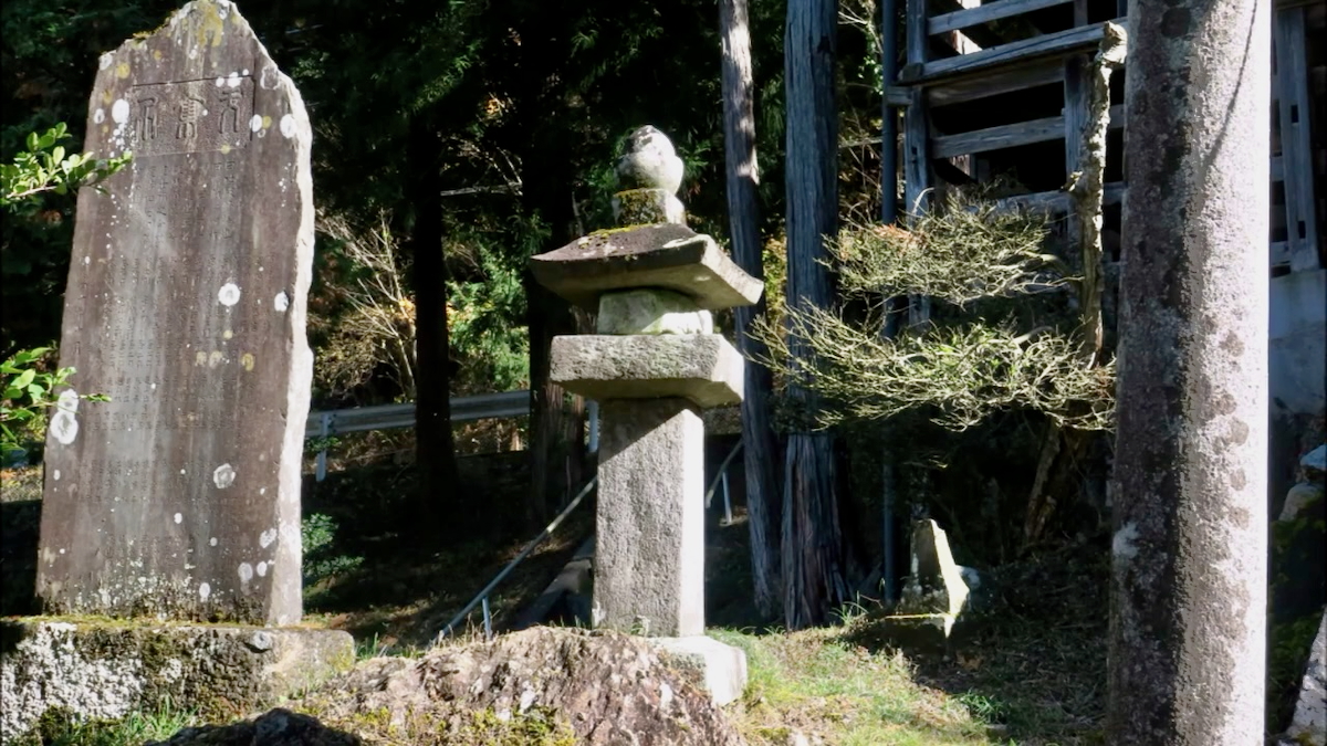 左手に文字のない石塔が三基。杉林の奥に社殿が見える。