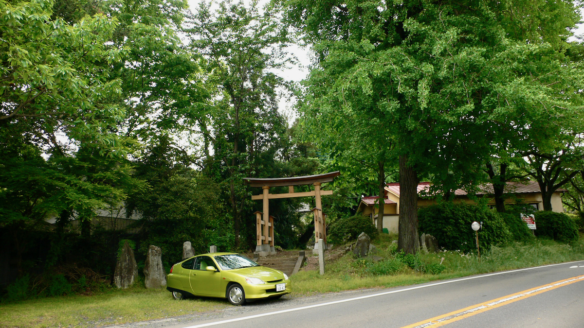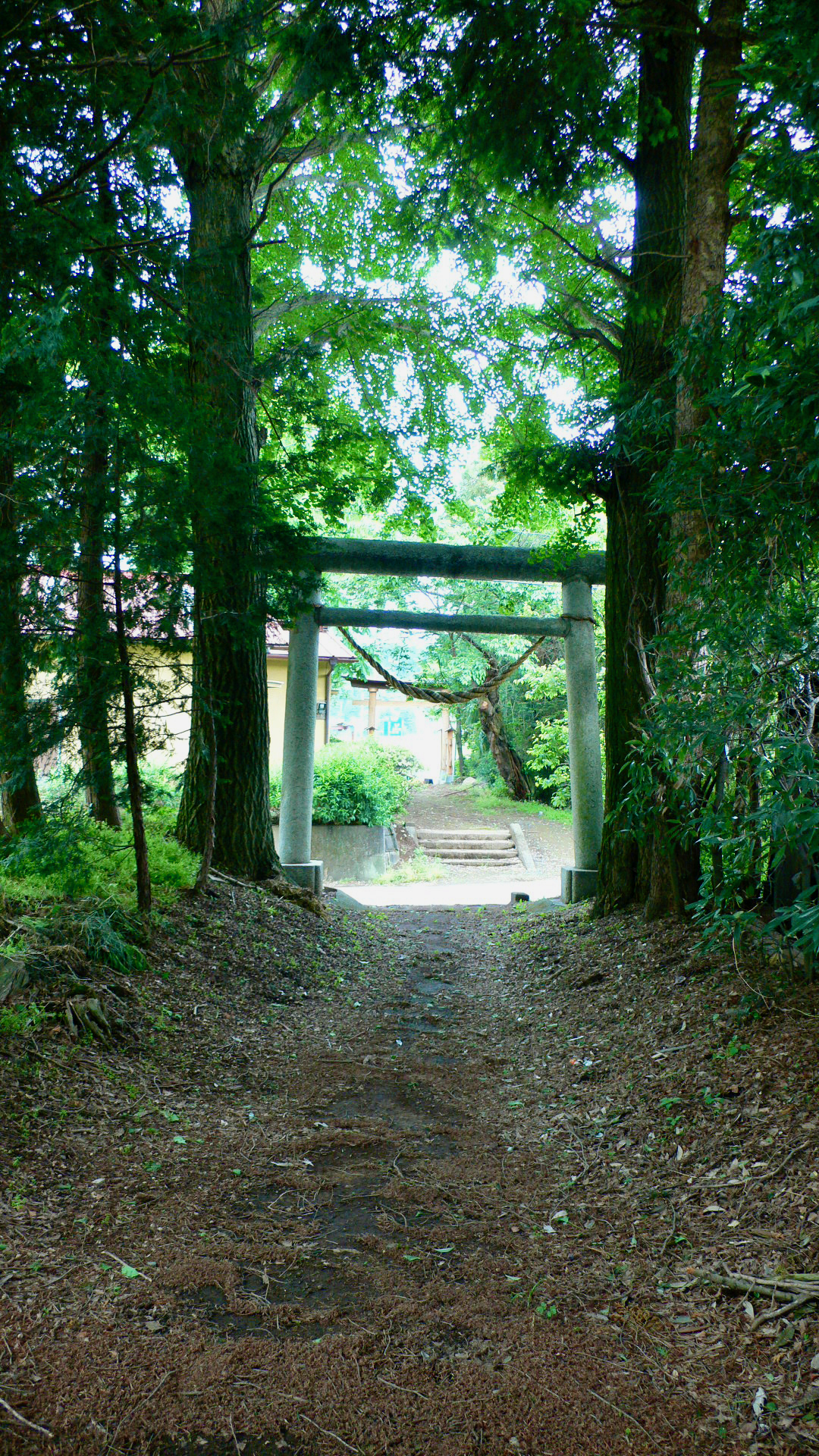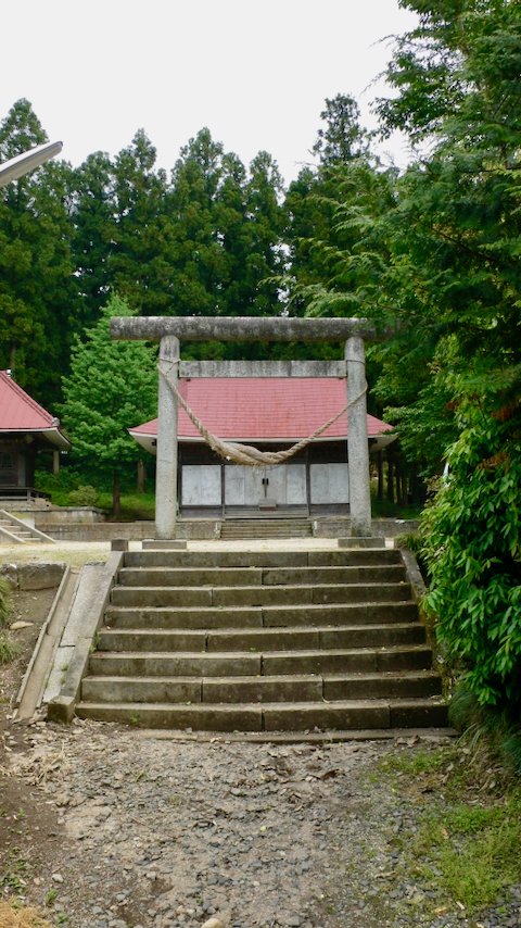 参道が途切れて舗装道路を渡ると石の鳥居。広場があり,石段を登ると拜殿。拜殿内部は見えない構造になっていて残念。