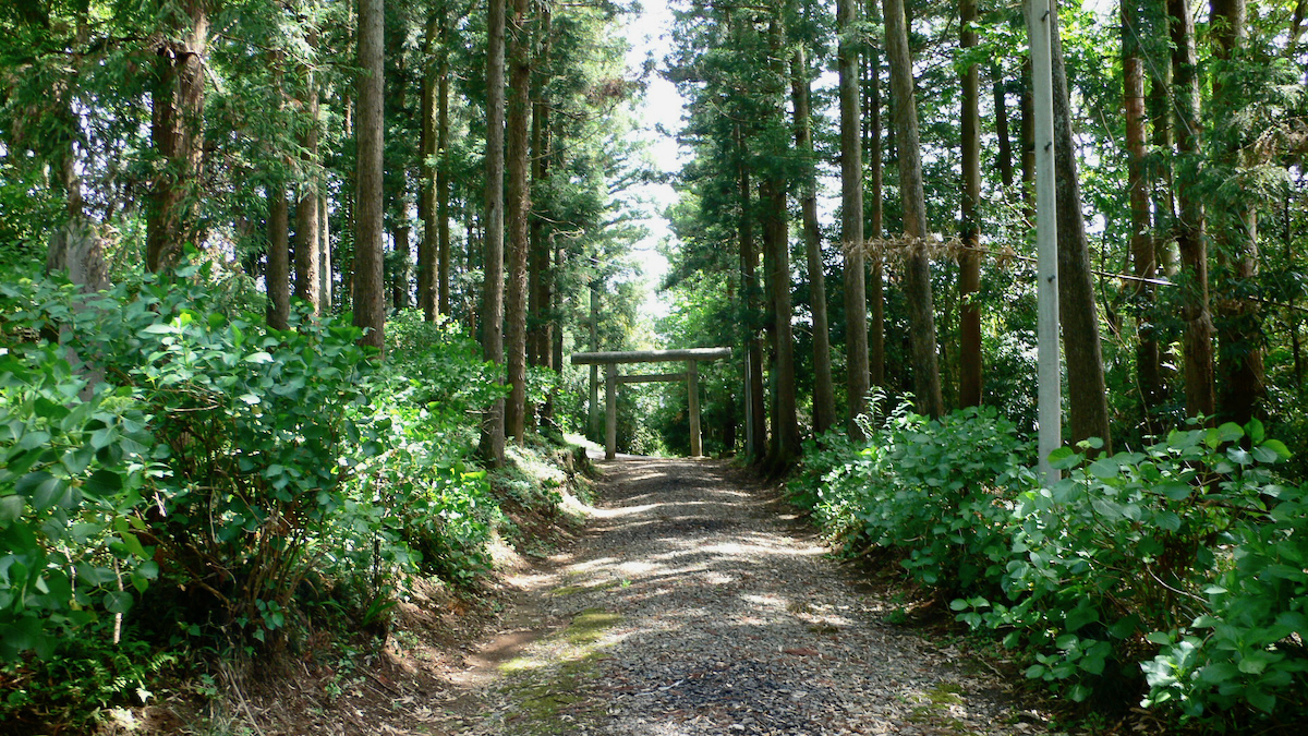 杉林の中に神明鳥居(昭和10年)が見える。大正九年の社号標には「村社高龗神社」口3つが罒型。花崗岩に刻字するのに口3つより彫りやすいという事情があるのだろう。