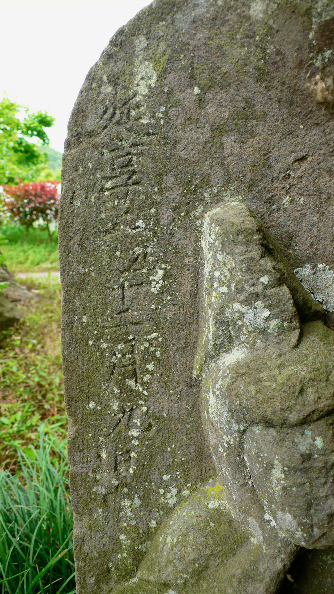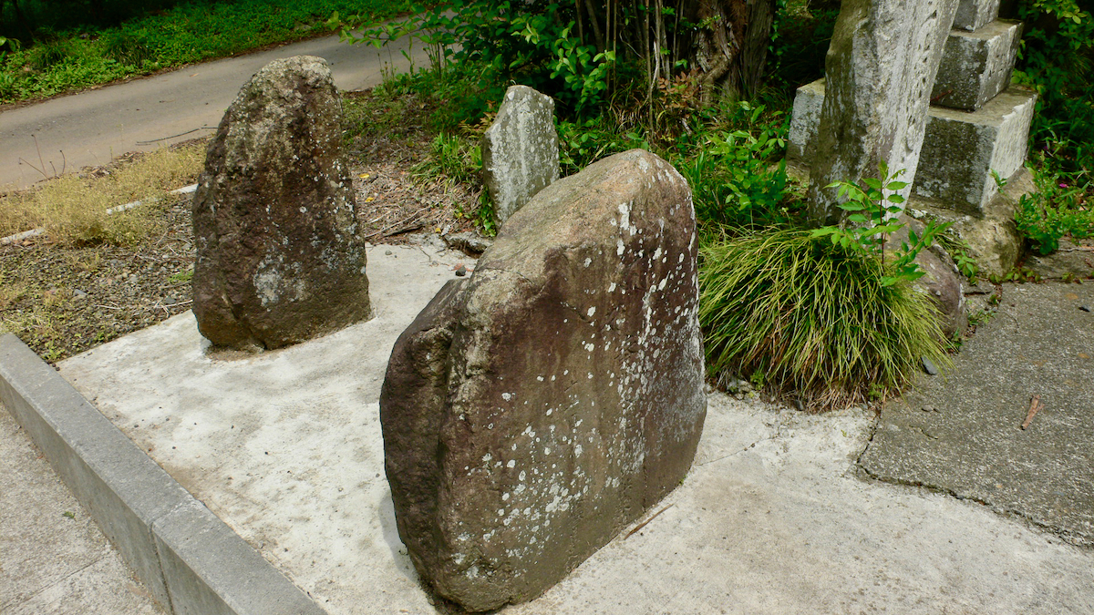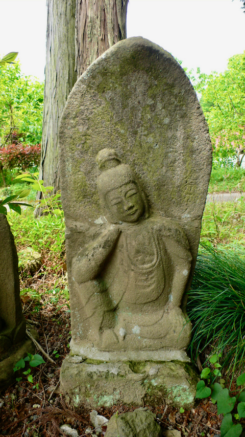 年代の分からない古い石塔,崩れた石像,合掌像が右手に並ぶ。