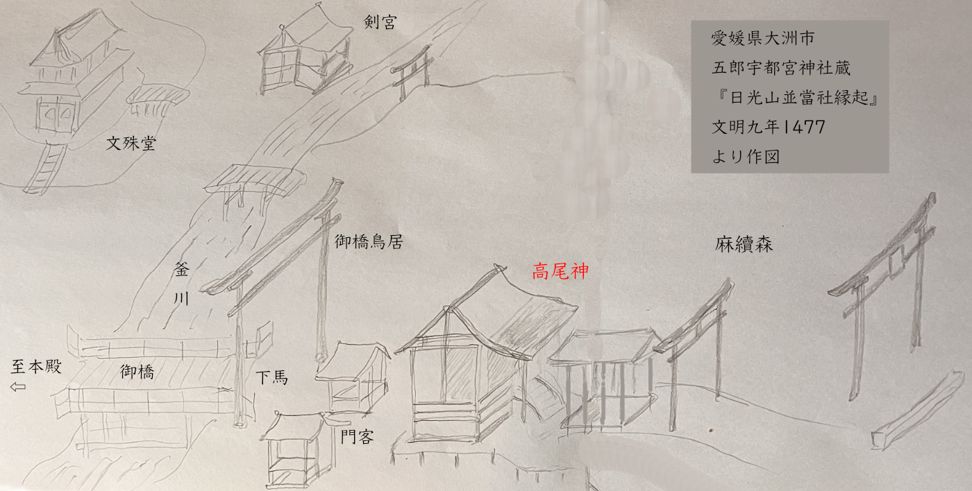「日光山並當社縁起」にはもう一か所「高尾神」のキャプションつきで祠が描かれている。絵図は南端から北に向かって,参道を右から左に進むように描かれていて,南端の中程度の鳥居には左右に「贄木nieki」の文字つき樹木の絵,くぐるとすぐに小型の鳥居があり右の柱の隣りに「