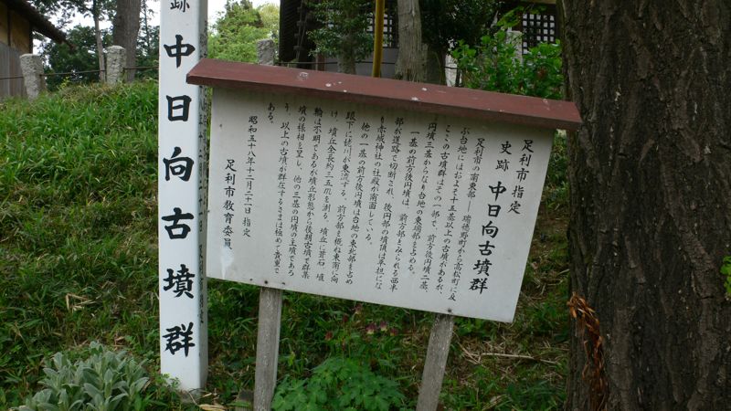 中日向古墳群は姥川沿いの前方後円墳2基と円墳3基からなる。1号墳の後円部の上に赤城神社が鎮座する。