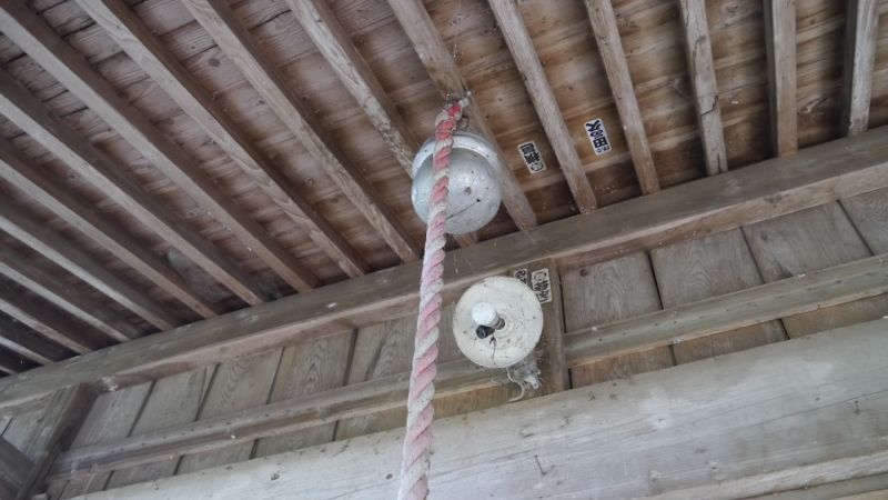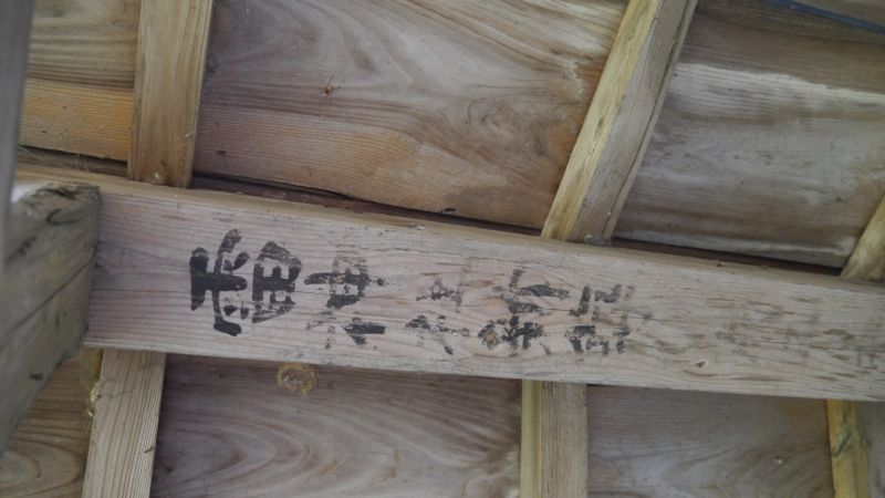 昭和弐拾九年七月弐拾弐日・雷神社新築の文字が覆屋棟木に書かれている。