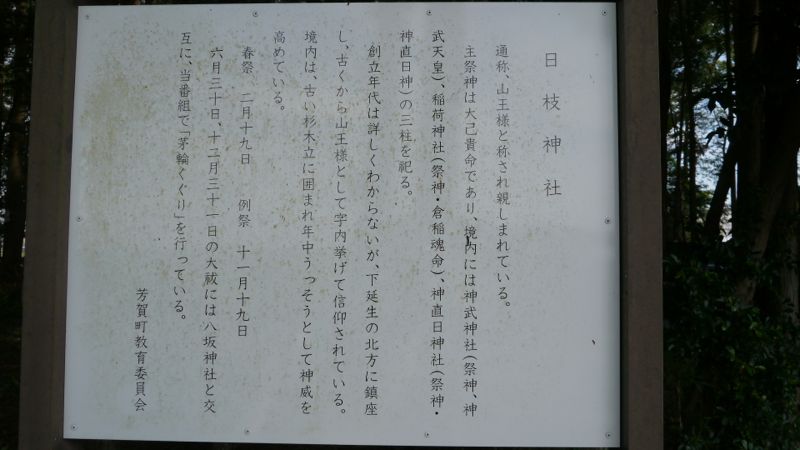 芳賀郡祖母井村大字下延生鎭座 村社日枝神社 祭神大己貴命 建物本社六尺四方 拝殿間口三間奥行九尺 華表一基 氏子六十五戸 社掌北村采三住所前仝 本社創立不詳 社域四百三十坪字綾住に鎭し末社三社を有し風景佳なり