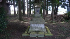 平成11年石鳥居。平成2年旗杭。右手の昭和10年石祠は天照皇大神。