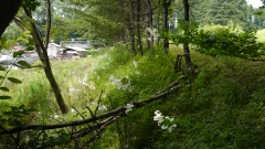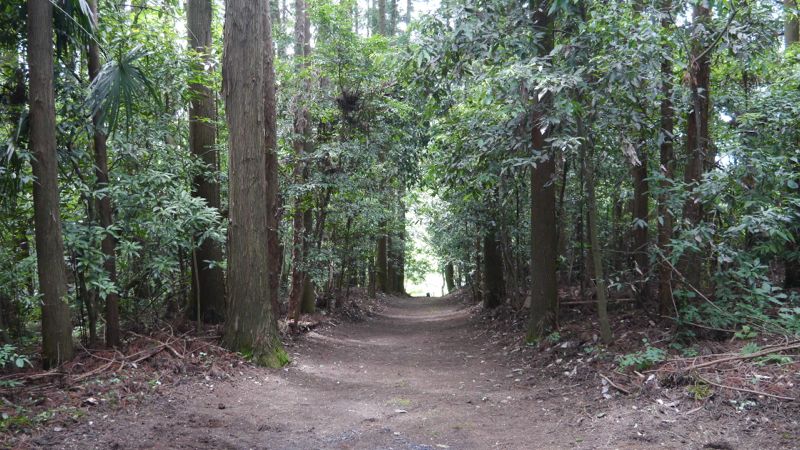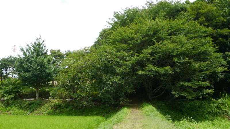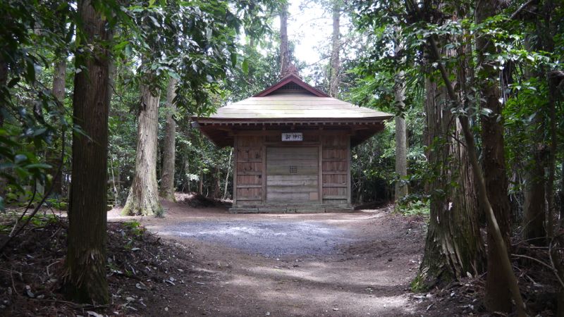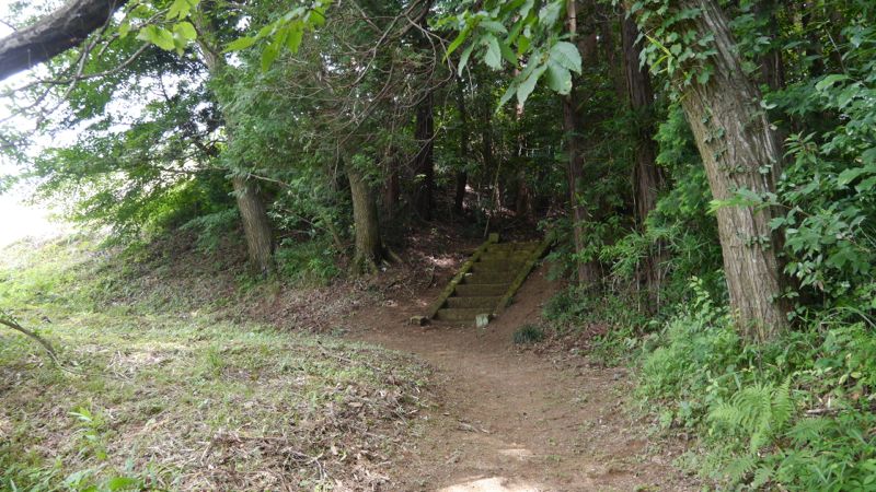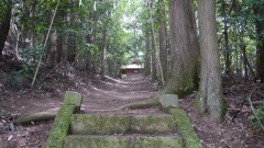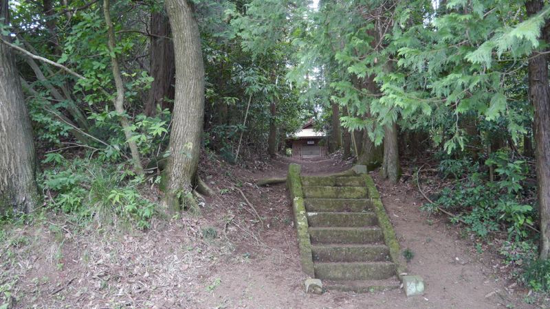 井頭公園東,鬼怒川と五行川に挟まれた南北に延びる洪積台地に鎮座。五行川まで広大な田園地帯。西高橋の穴不動が道路沿いにあるので,そこから推定しながらさがす。「この先行き止まり」標識を入ると左手の山腹に石塔が見え隠れ。行ってみると墓所になっており,「故神職」の石碑があった。この近くだろうとさがし続けると,少し戻ったところに石段が見えた。墓所の北隣りになる。