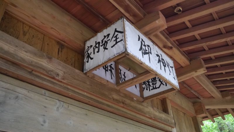 7月14日境内社八坂神社の例祭に掲げられた手作りの御神燈には五穀豊穰と家内安全の筆文字。