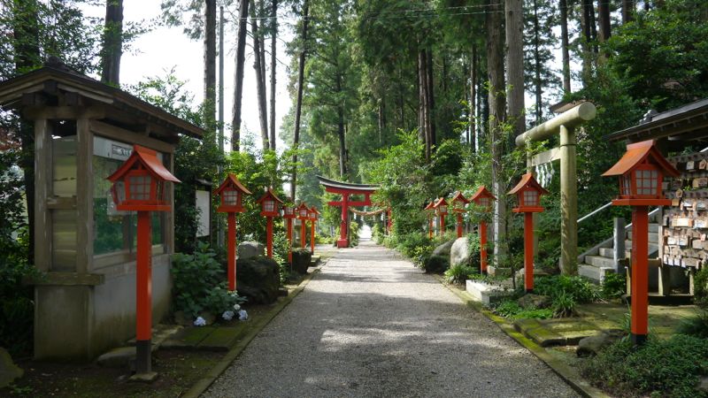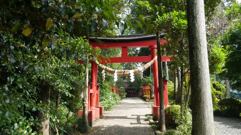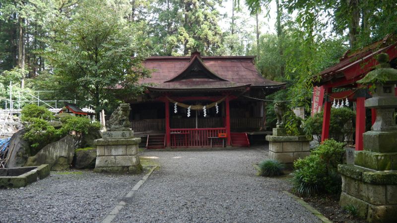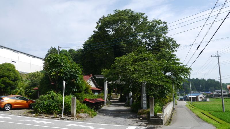 承元元年1207九月十九日字大久保の地に創建。元禄十三年1700再建,明治三十一年1898本殿銅葺屋根他の大修理。 一の鳥居は明治二十六年1893石製。古い方の社号標は大正五年1916。二の鳥居は朱色も鮮やかな両部鳥居。