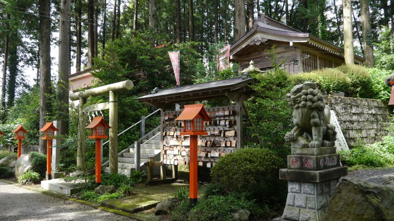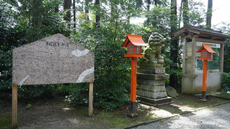 参道入ってすぐ左手奥に安住神社社家祖霊社。さらに進むと左手に「額殿絵馬殿展示館」つづいて「下原稲荷神社」。石製鳥居右手に多数の絵馬。向かい側には大きな一枚の絵馬に多数の願掛け。