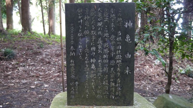 石段手前に石亀と八幡宮由来・神亀由来御影石。康平二年1059創建とある。小宅に遷宮したのは建久八年1197。
