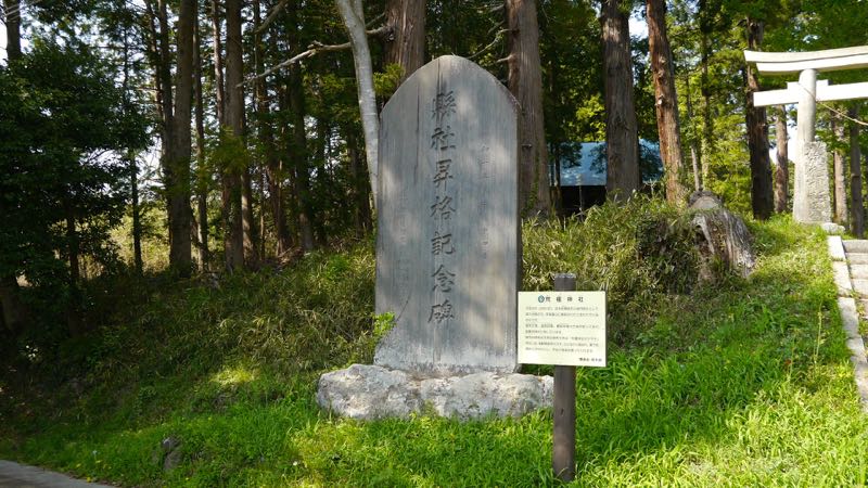 昭和二年(?五?読みにくい)一の鳥居手前に縣社昇格記念碑があり右手に環境省の立てた簡単な解説板がある。由緒の看板も大同元年806創建としている。いずれも桔梗城の鬼門除けとして創建と記述しており,大同元年806には城が存在したことになっていて混乱する。築城は300年ほど後のことではないのか。築城より先にあった社を鬼門除けとして利用したとすべきだろう。