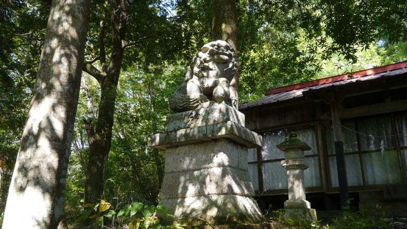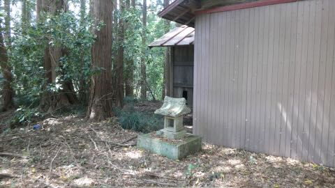 藤田鹿島神社から223号線で1.7キロ,南大和久の交差点を300m南下するとステンレスの旗竿が見える。そば処宮下の奥に昭和五十二年1977の石鳥居。草野参道を行くと石段になり上方に社殿が見える。上ってみると間口の広い拝殿で,近づくと写真では全容が映らない。昭和30年1955狛犬。