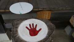 切り株断面に「至福の手形」が彫ってあり,左手を当てて願い事をすると叶う。すばらしい。