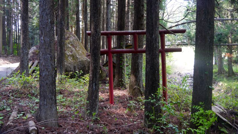 砥川ぞいに日光フラワーパークに向かって進むと左手に一字一石塔のある高雄神社があり,そこを超えてしばらく行くと左手に小さな鳥居が見える。進行方向を向いて小祠が建てられており,鳥居は道を向いている。