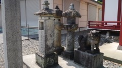日光街道とバイパスが合流するすぐ西の旧街道沿いに平成十二年奉納の鳥居が見える。鳥居正面に見える石宮が八坂神社。石燈籠一対。右手に白雲山,石祠一基,石燈籠一基。本殿となりの建物は推定神輿庫,中が見えない構造。