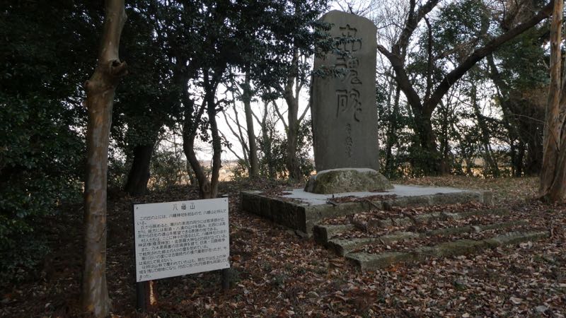 八幡山の参道を登ると木立に囲まれて石宮が鎮座する。正面左手が八幡神社。右手は神日本磐余彦命(昭和62年の社号標表記は神倭伊波禮毘子命)を祀る橿原神社で神武様と呼ばれている。石宮には「橿原宮」と刻まれている。